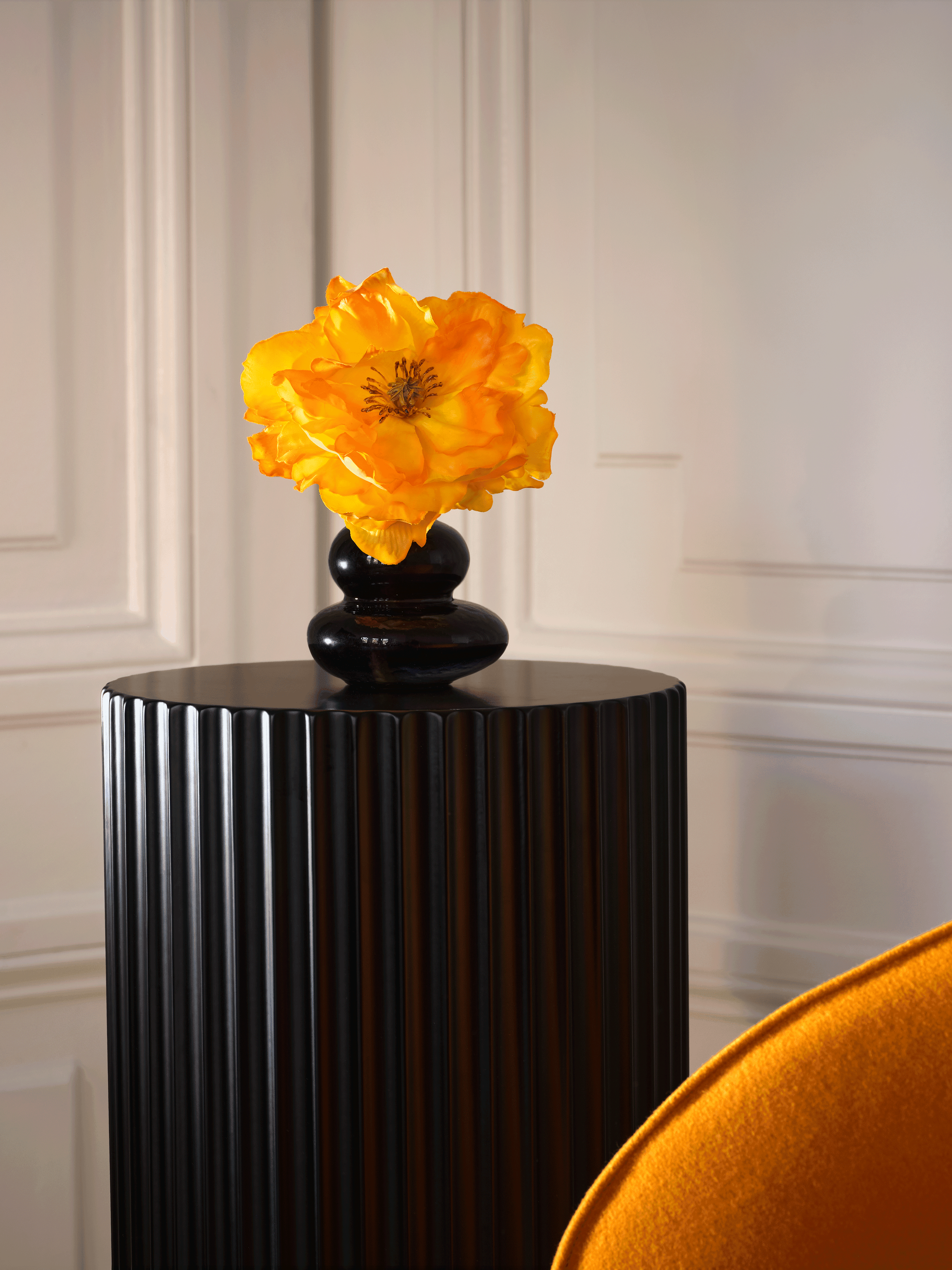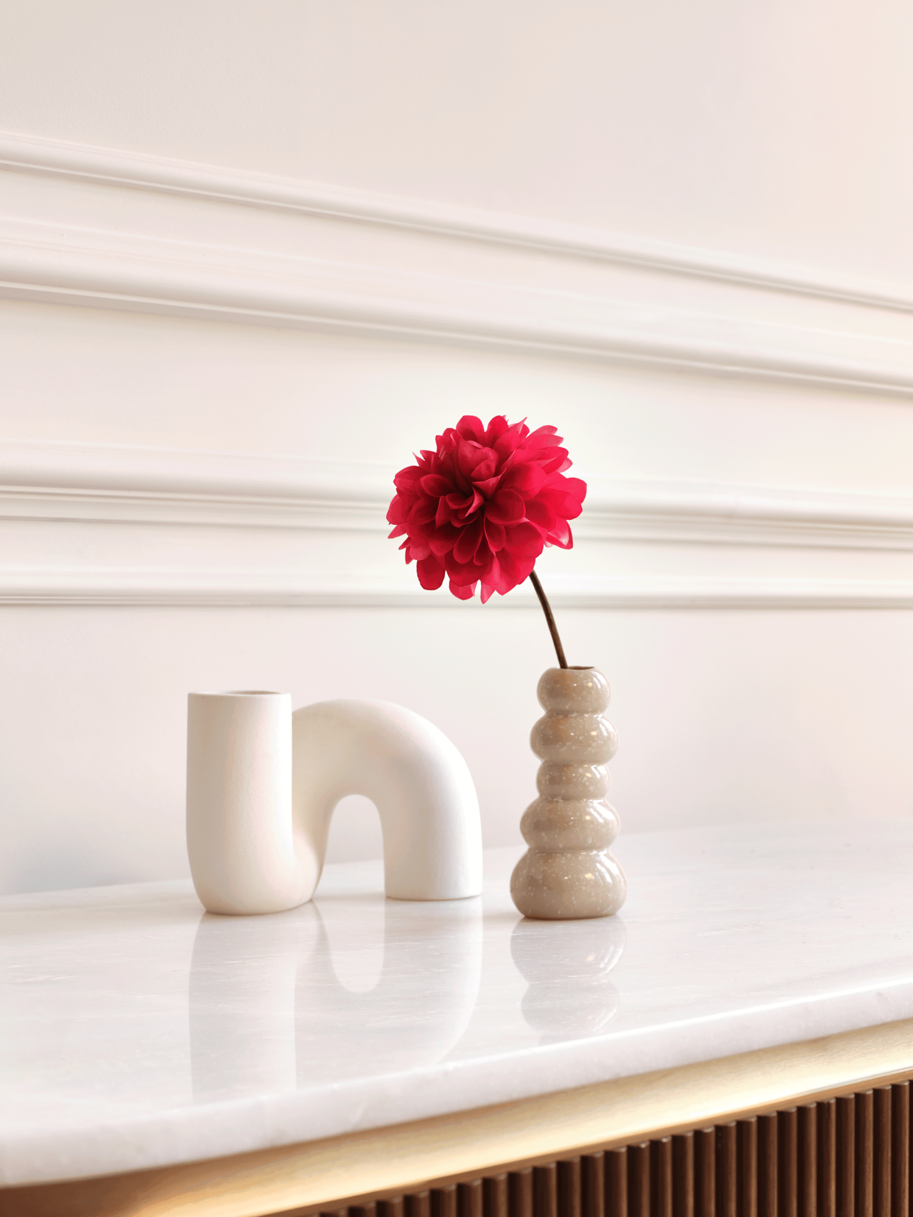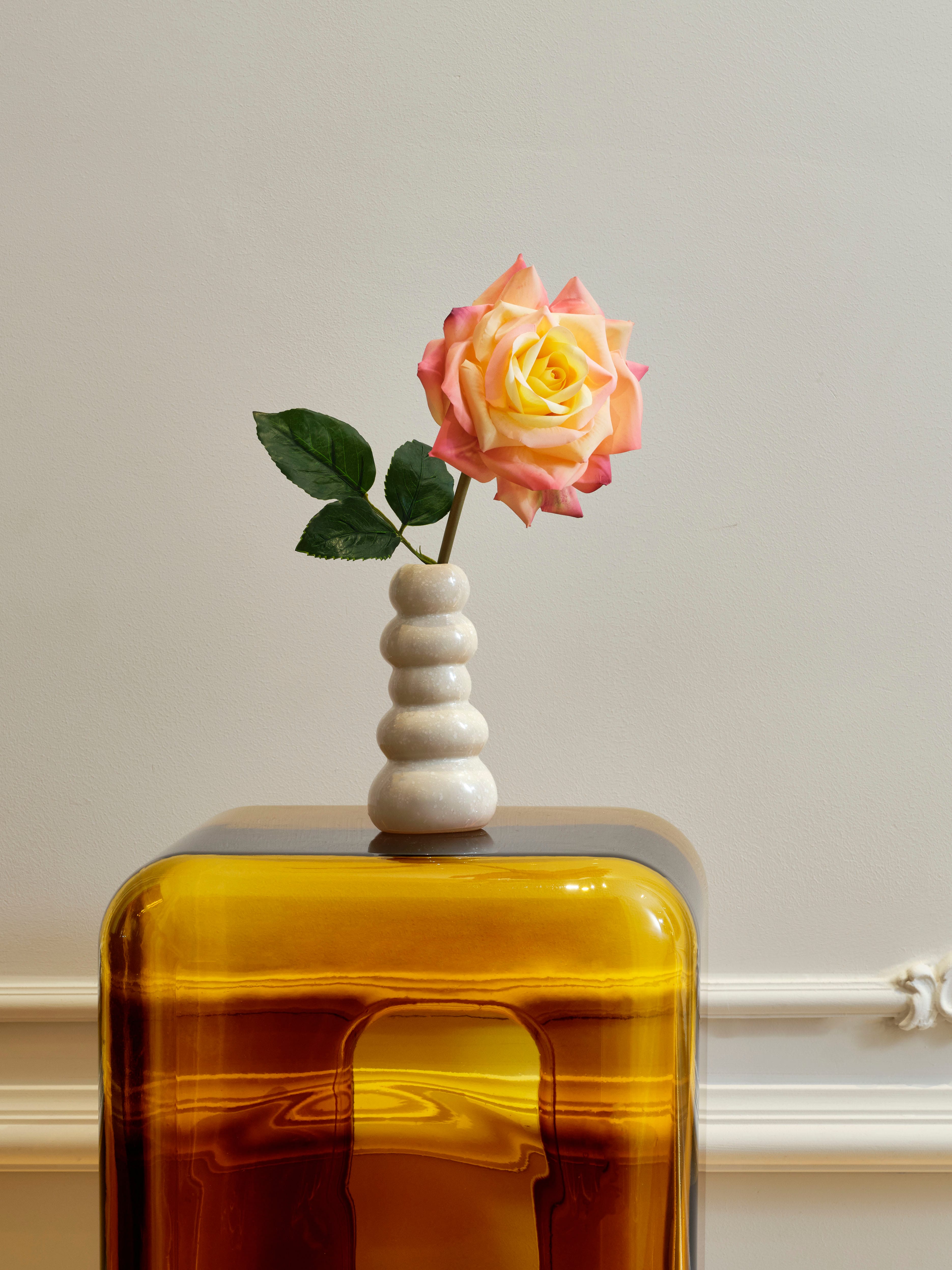 Klein van formaat maar groot van karakter, deze elegante zijden bloem in een klein organisch tafelvaasje is perfect voor eettafels en geeft jouw interieur een charmante twist.