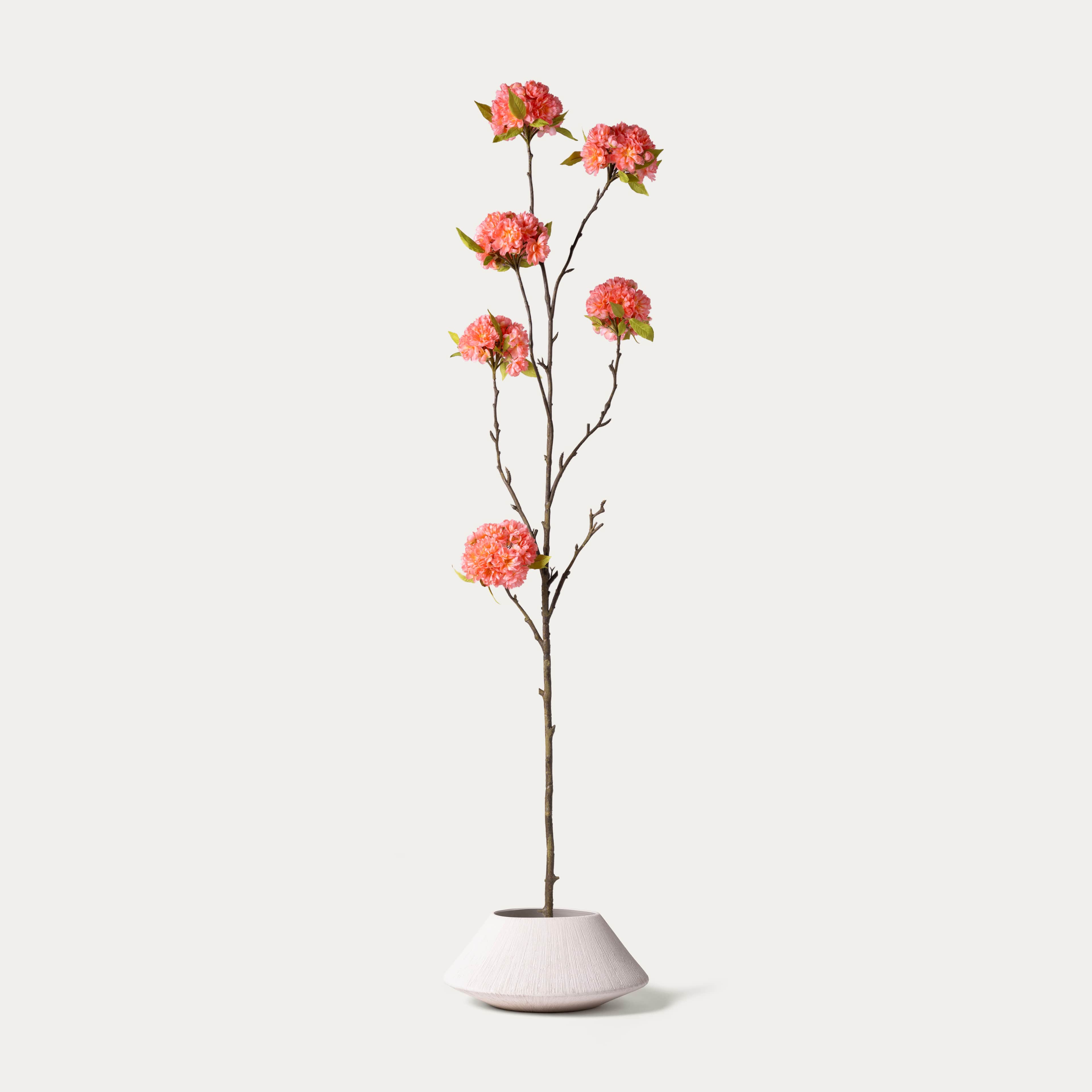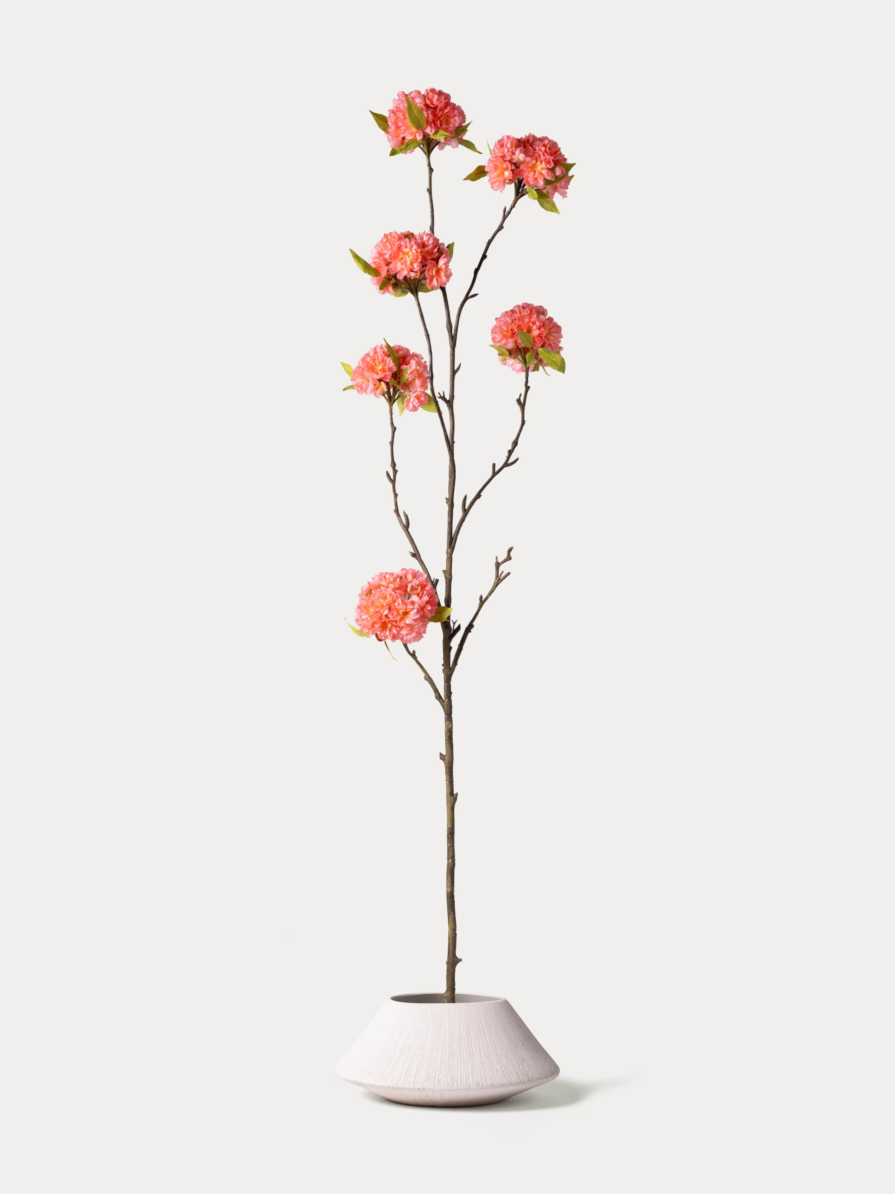 Een dromerige masterpiece met perzikkleurige volle bloesems in een organische beige vaas.