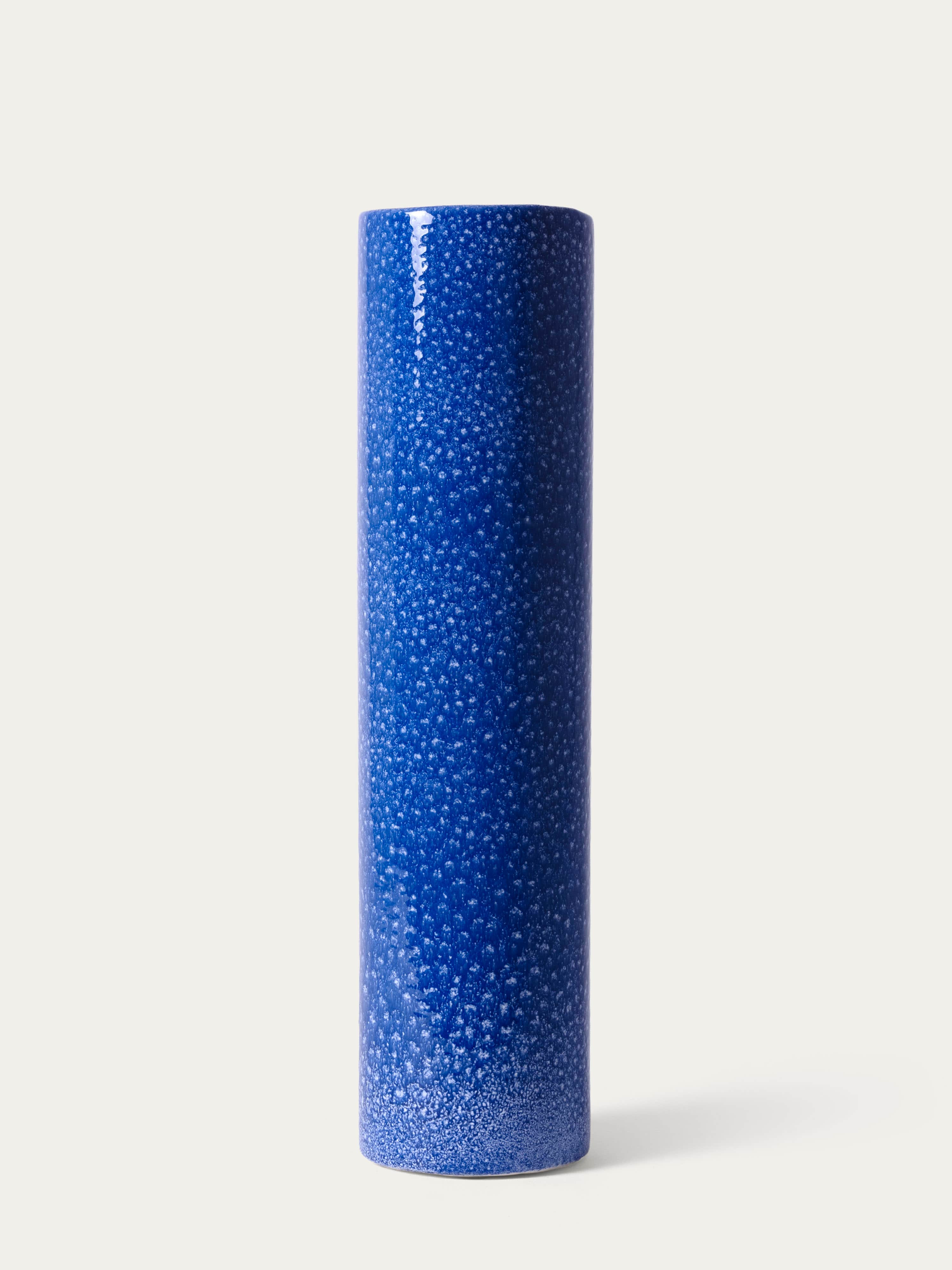 Een slanke blauwe vaas met fijne spikkels in het glazuur. Elegant en vol karakter.