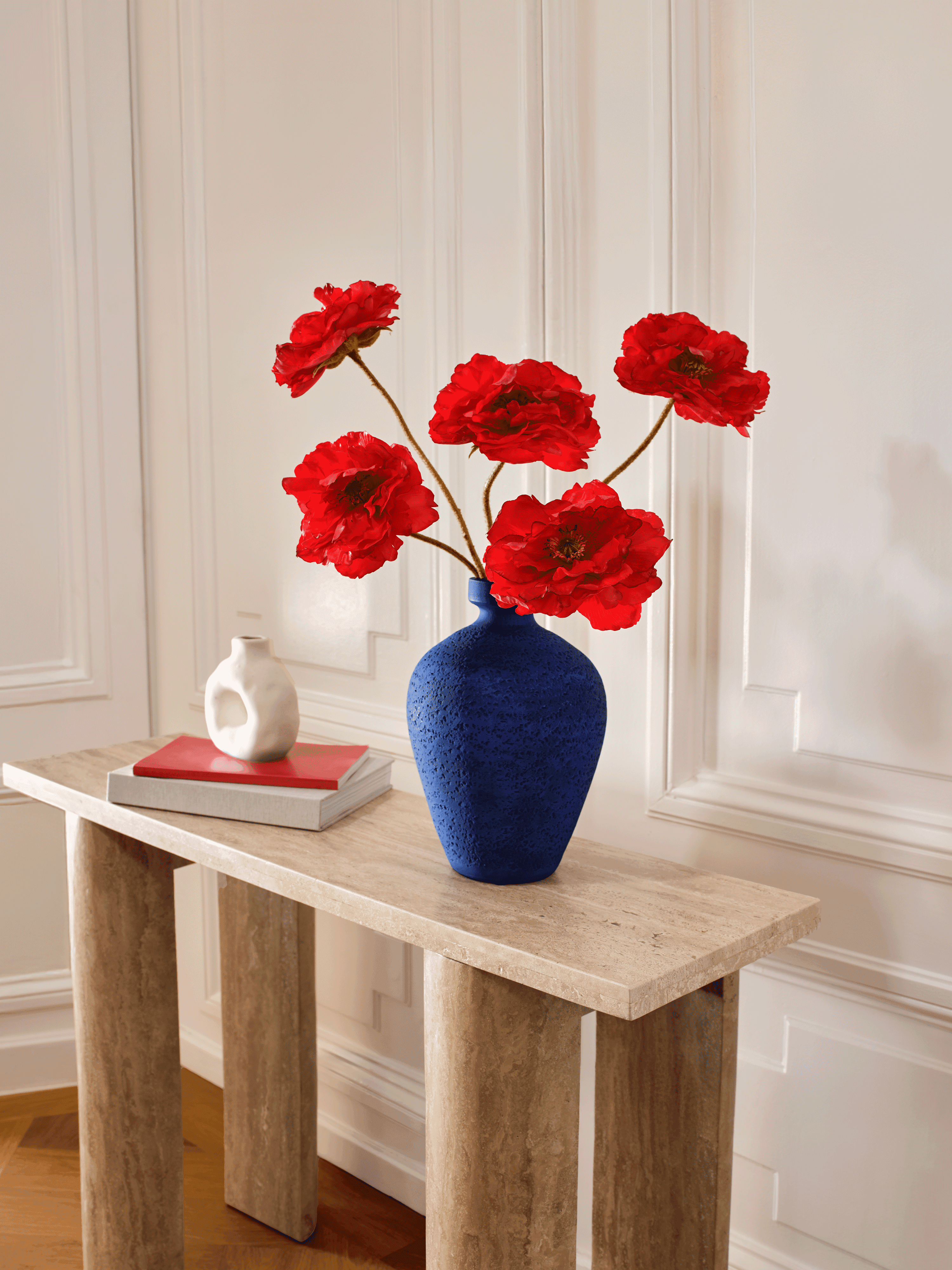 Een kobaltblauwe keramieken vaas met matte steenstructuur. Zacht van vorm, rijk van kleur.