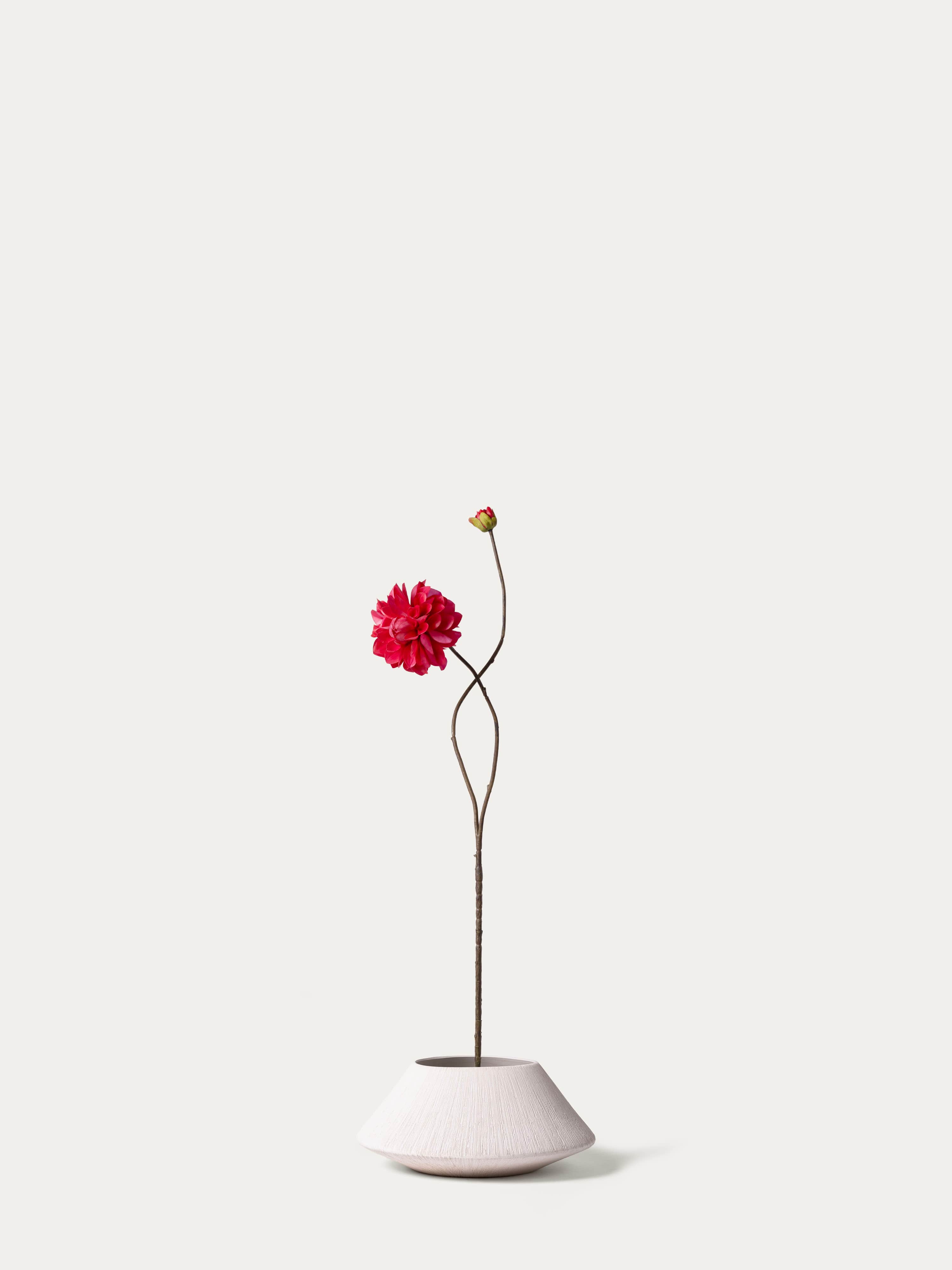 Een speels veldboeket waarin levendige kleuren samenkomen met een onverwachte vaaskeuze: een diepblauwe stenen vaas. Blauwe delphinium, gele dahlia en roze klaproos zorgen voor een dynamisch contrast.