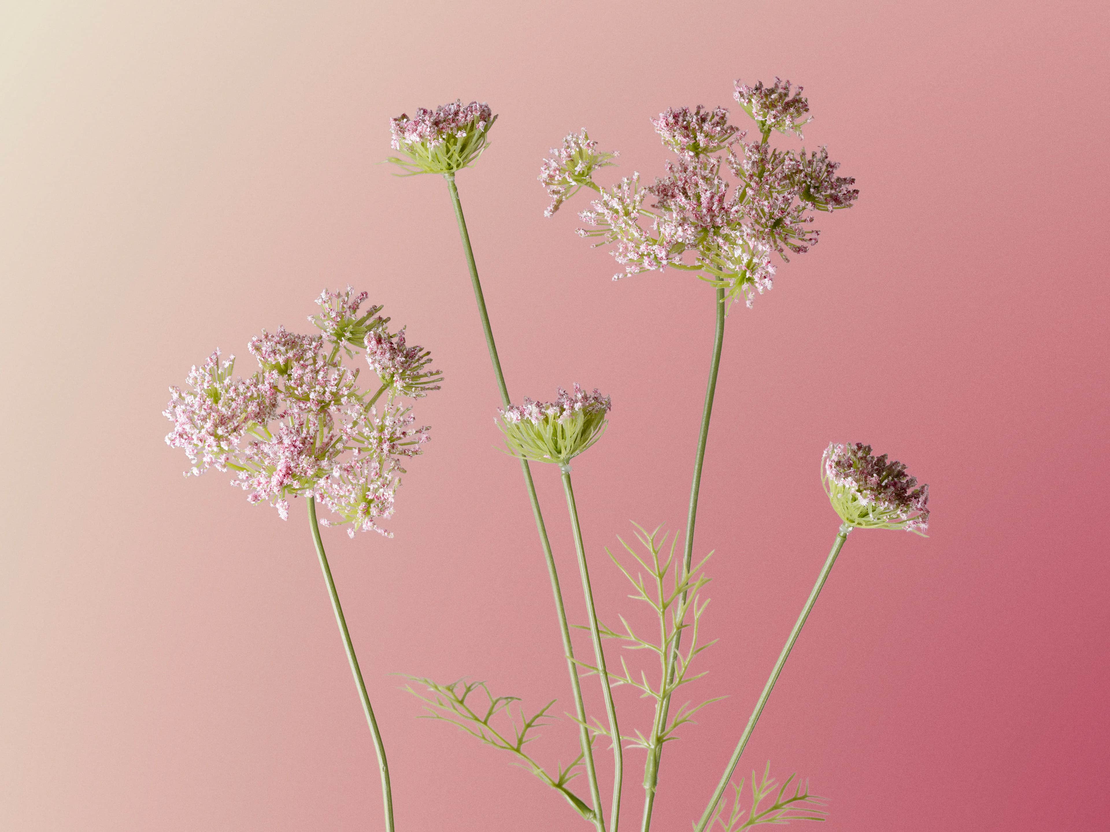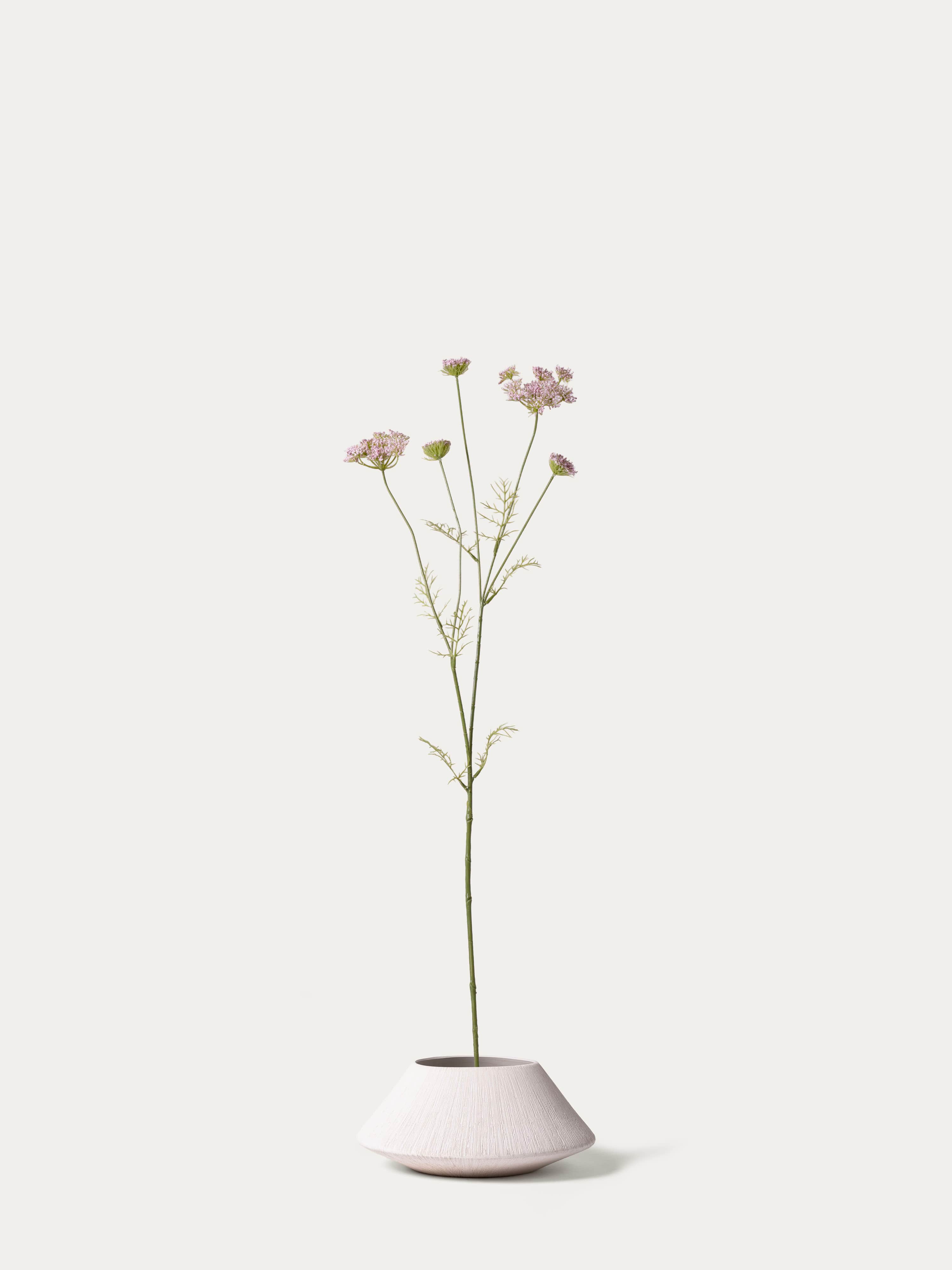 Een speels veldboeket waarin levendige kleuren samenkomen met een onverwachte vaaskeuze: een diepblauwe stenen vaas. Blauwe delphinium, gele dahlia en roze klaproos zorgen voor een dynamisch contrast.