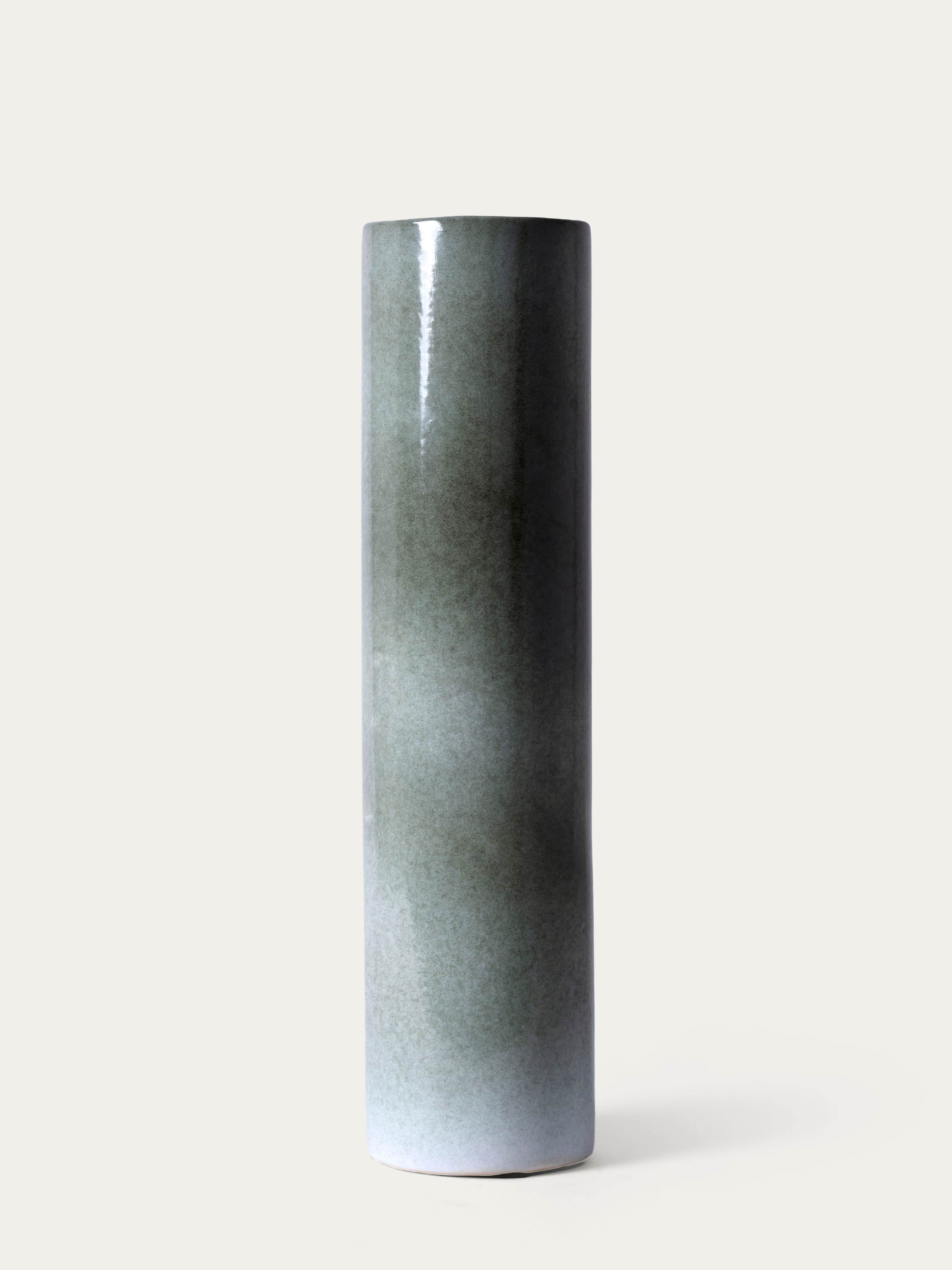 Een hoge, smalle cilindervaas in zachtgroen. Elegant en minimalistisch; ideaal voor een krachtig boeket of rustige takken.
