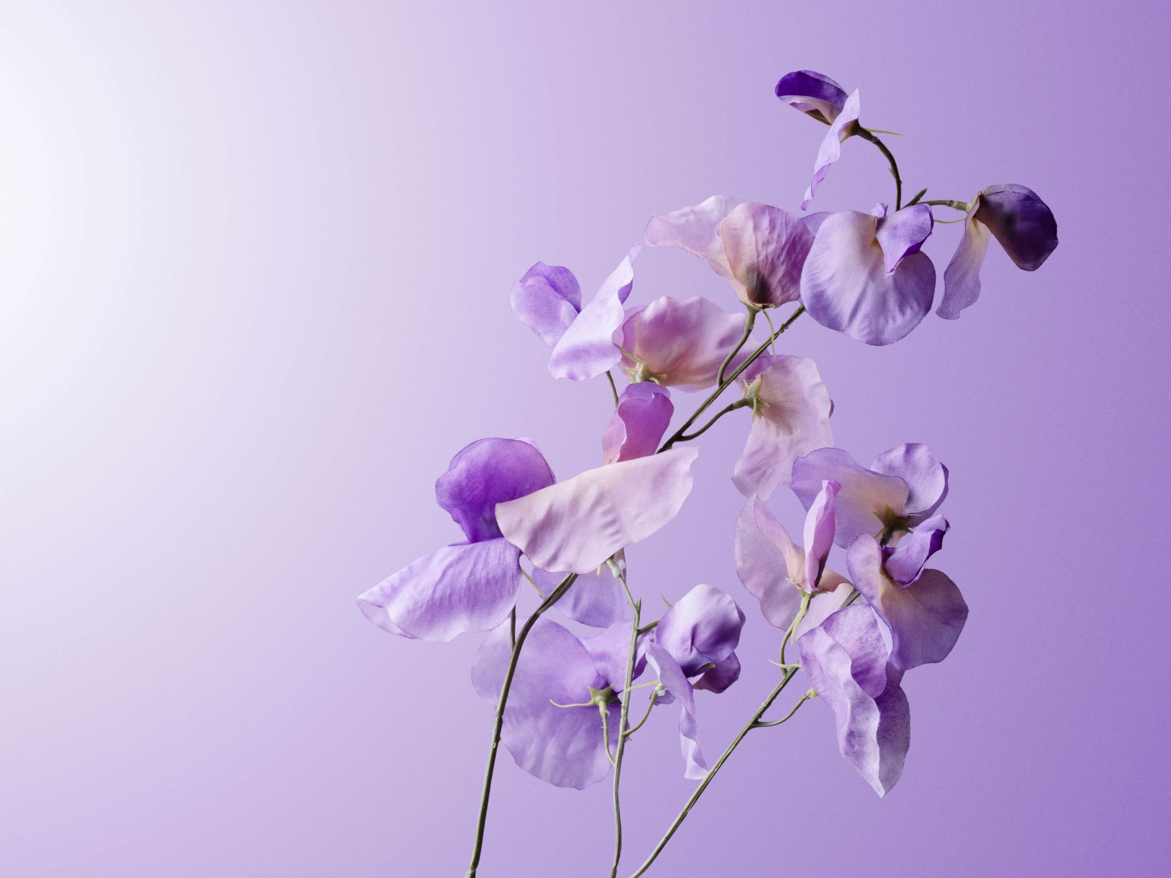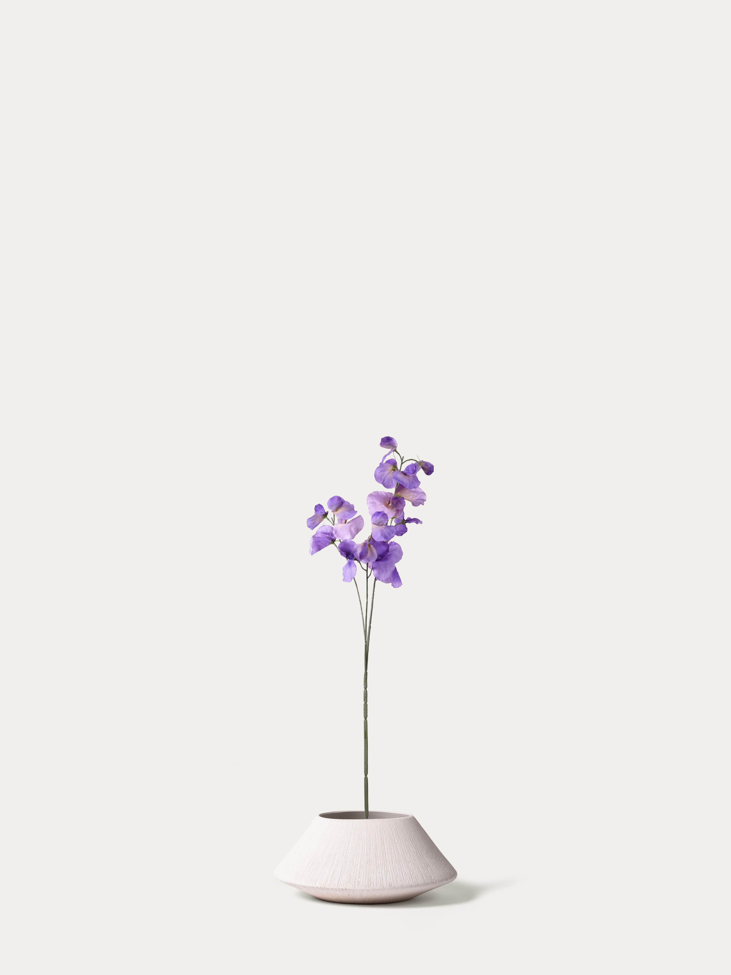 Elegant mono boeket van zijden lila lathyrus in een organische crèmekleurige vaas.
