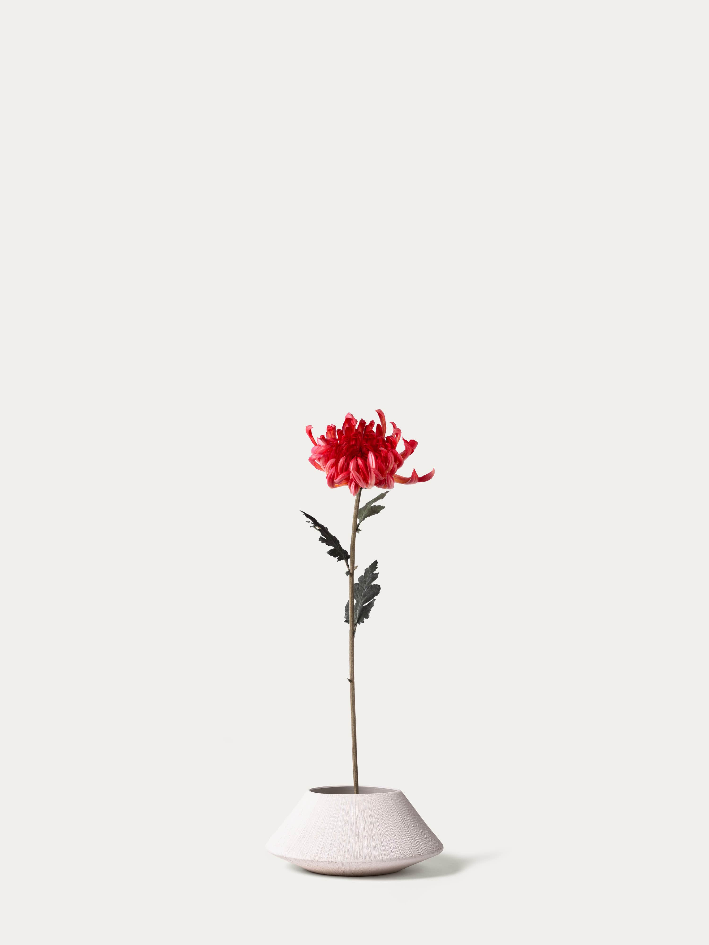 Zijden showstopper in een hoge, organische vaas met krachtige rode chrysanten.