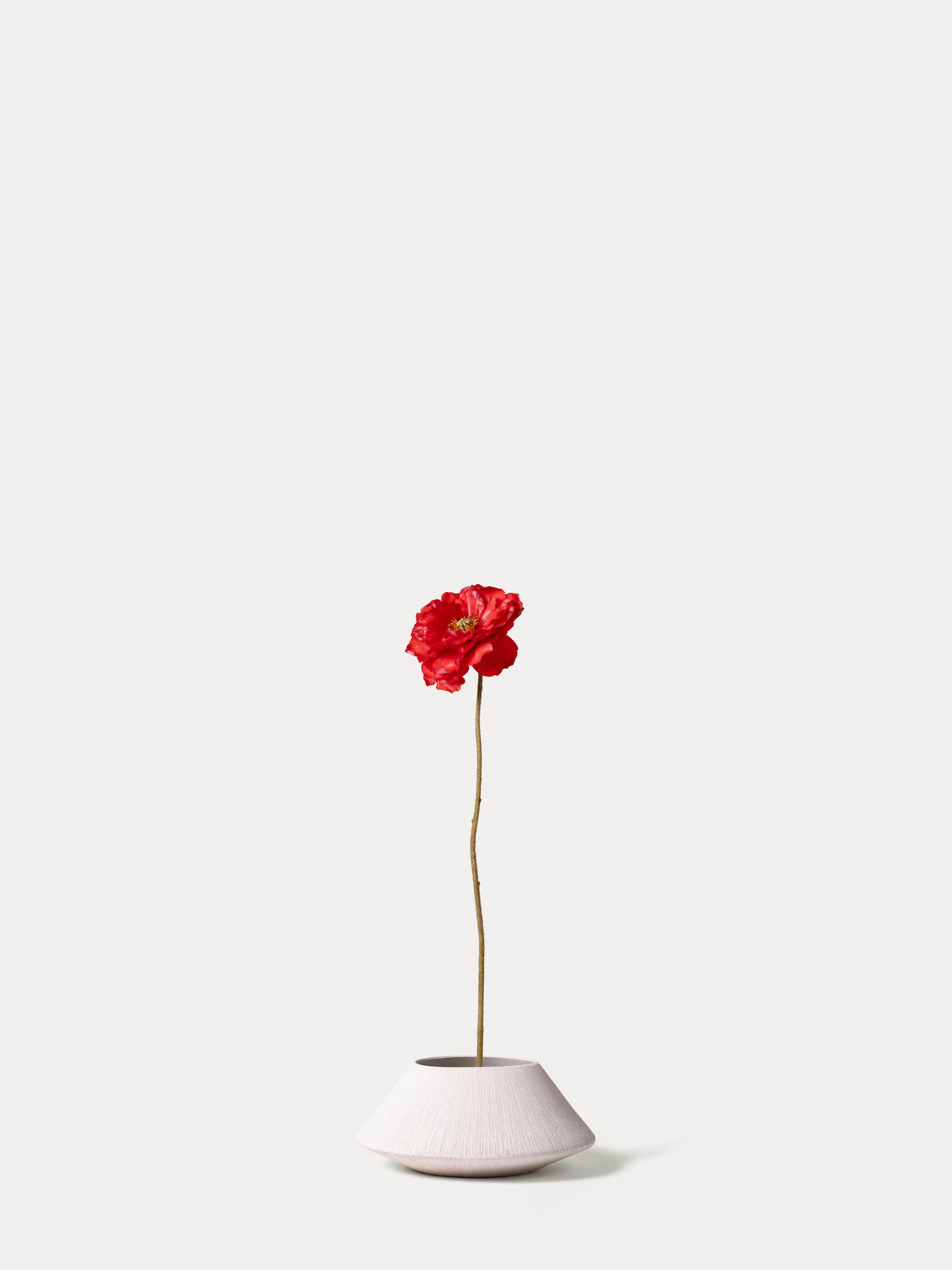 Dit gedurfde boeket met felrode real-touch klaprozen maakt een sterke statement in de blauwe stenen vaas.