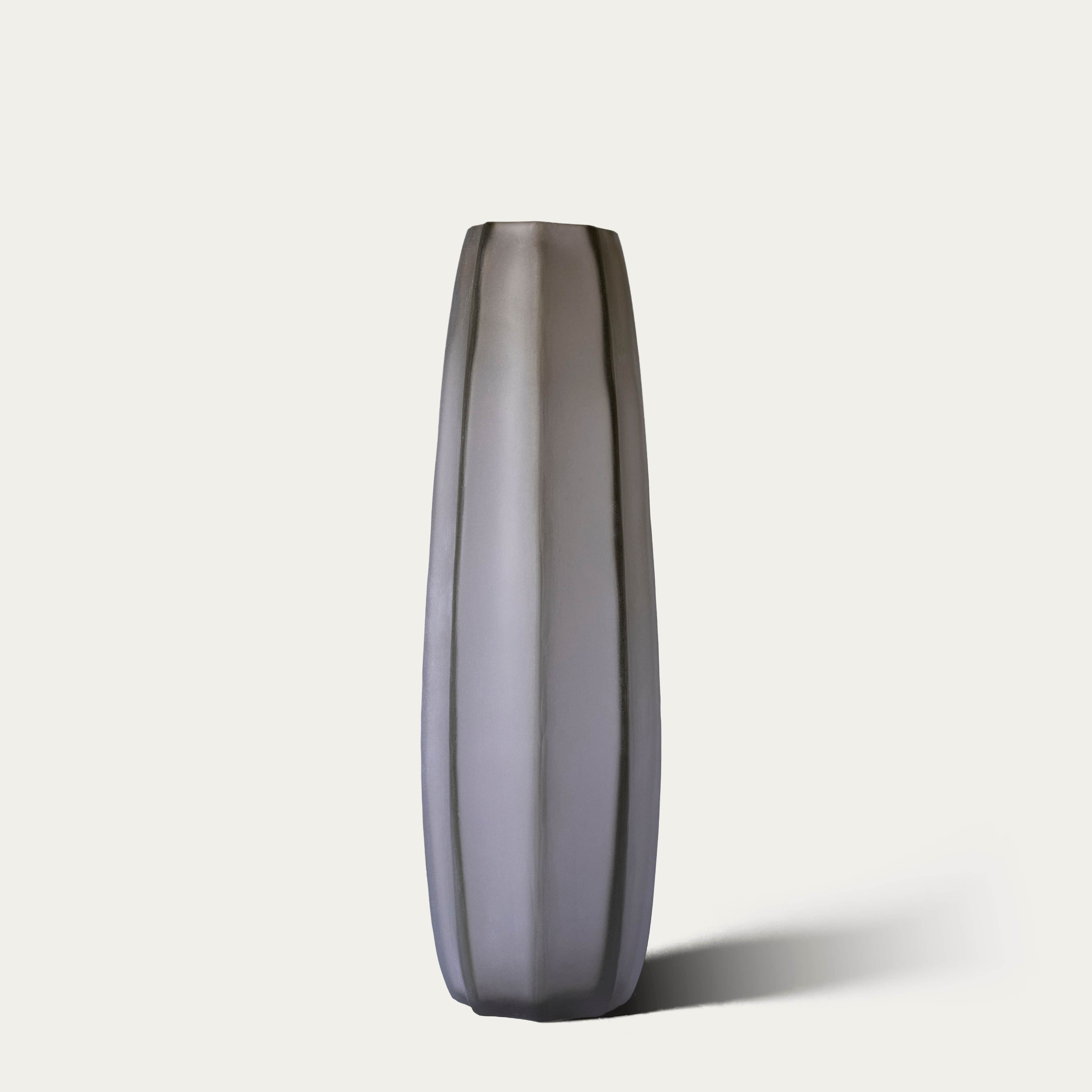 Een hoge, slanke vaas van lichtgroen mat, melkachtig glas. Zacht en eigentijds; een rustige basis voor je boeket.