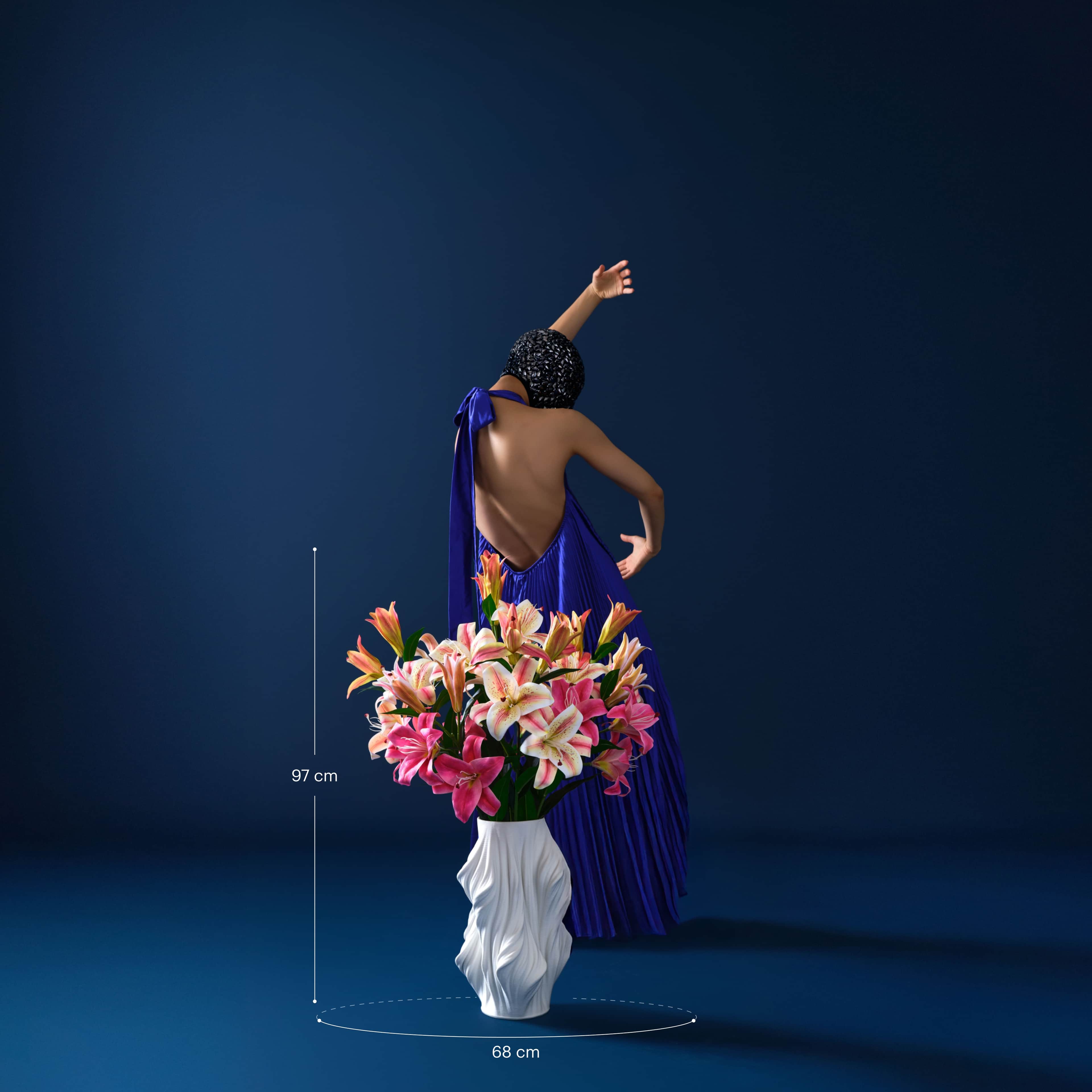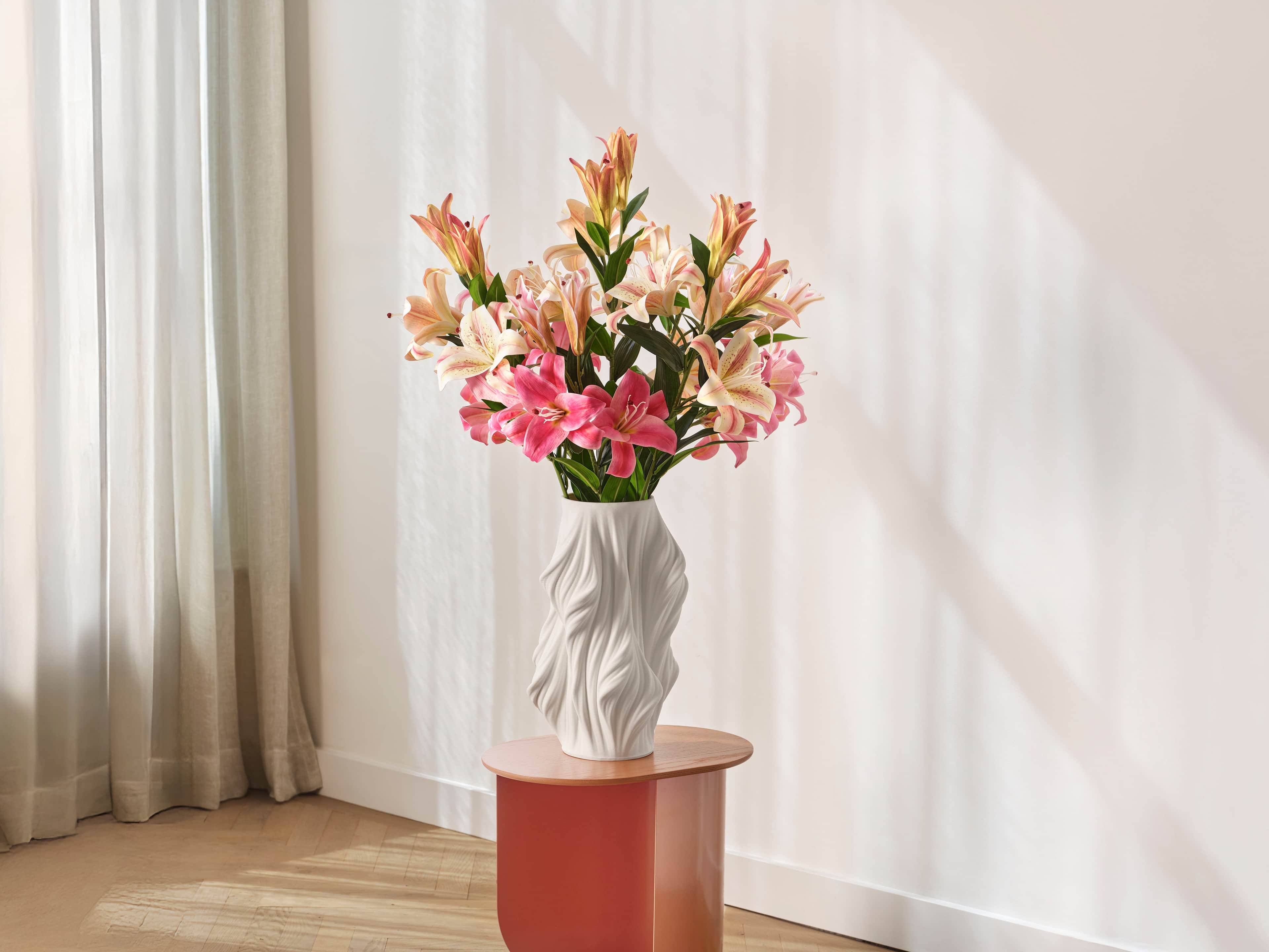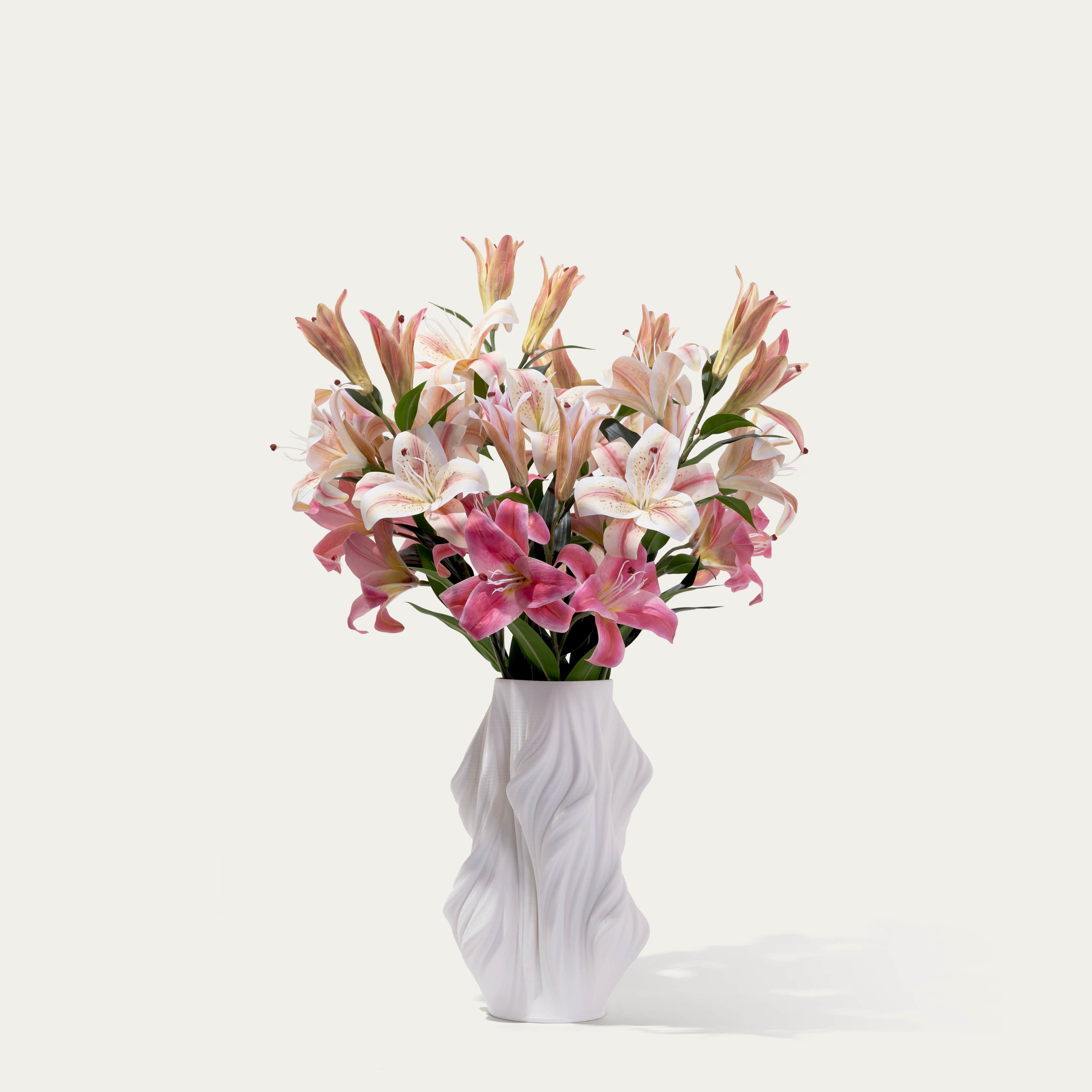 Mono boeket van licht- en donkerroze zijden lelies in real-touch kwaliteit. Prachtig geschikt in een grote organisch gevormde witte vaas. Dit boeket wordt geleverd met ons gratis bloemparfum.