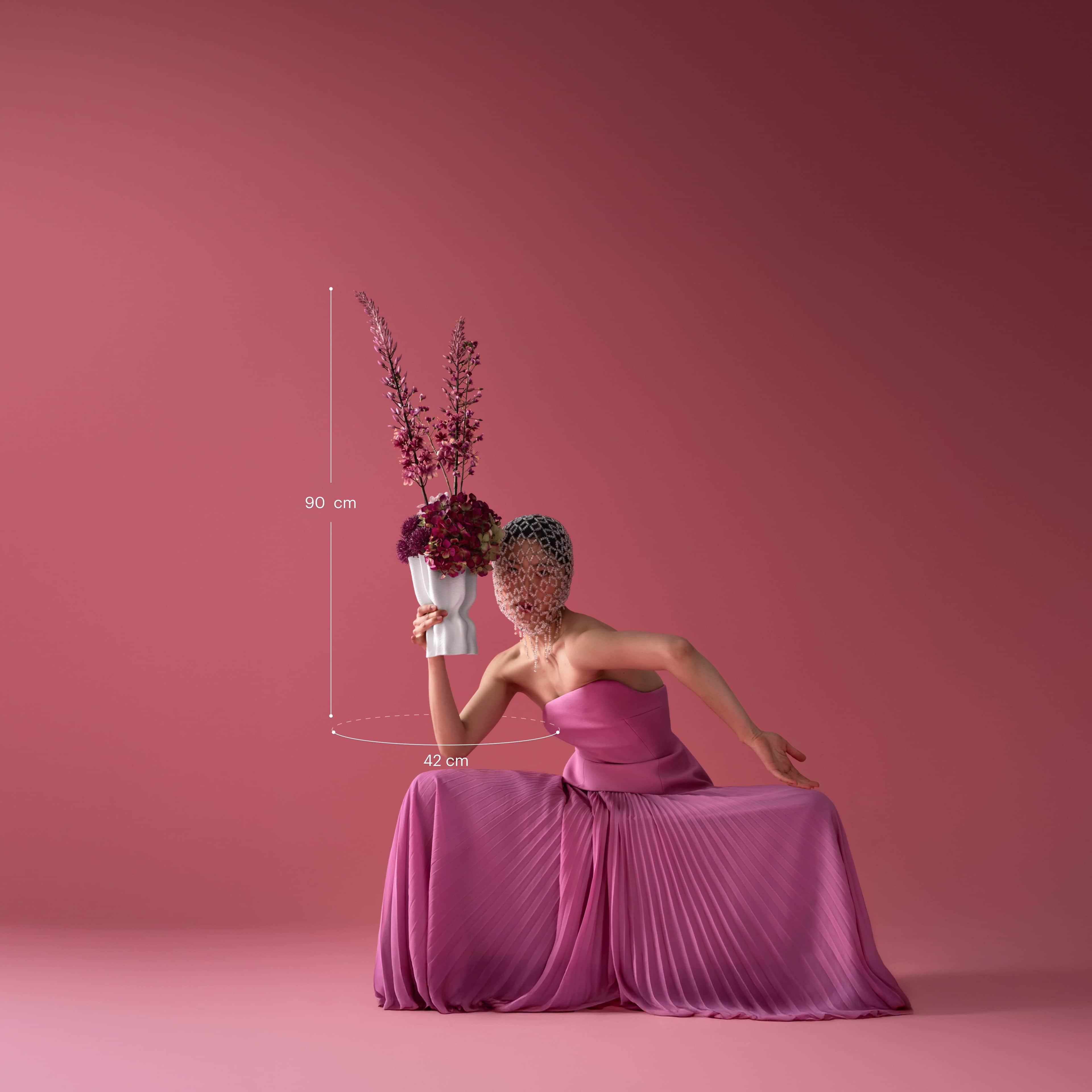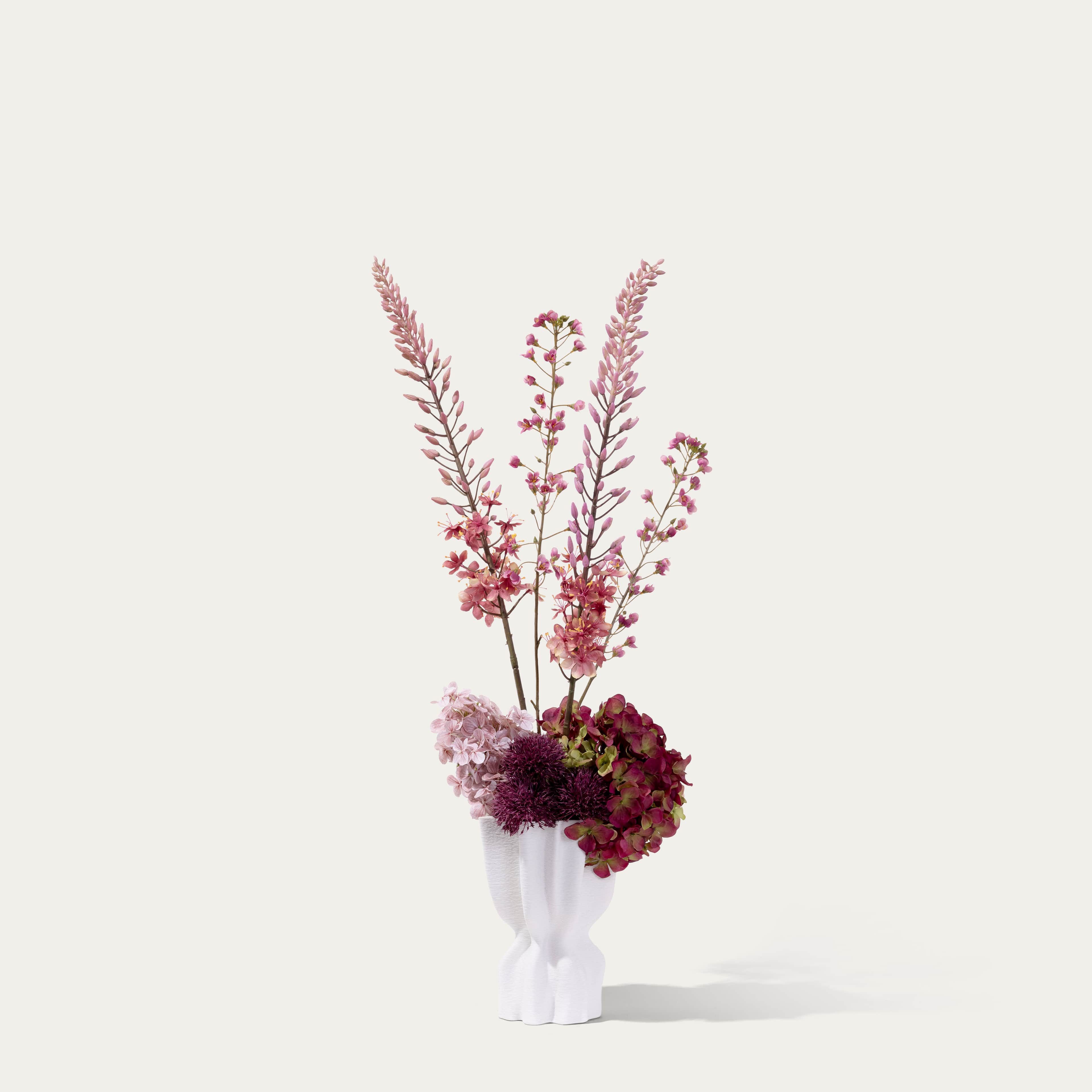 Boeket in blush- en bordeauxtonen met zijden eremurus, primula, real-touch hortensia en zijden allium, geplaatst in een organisch gevormde vaas in gebroken wit. Dit boeket wordt geleverd met ons gratis bloemparfum.