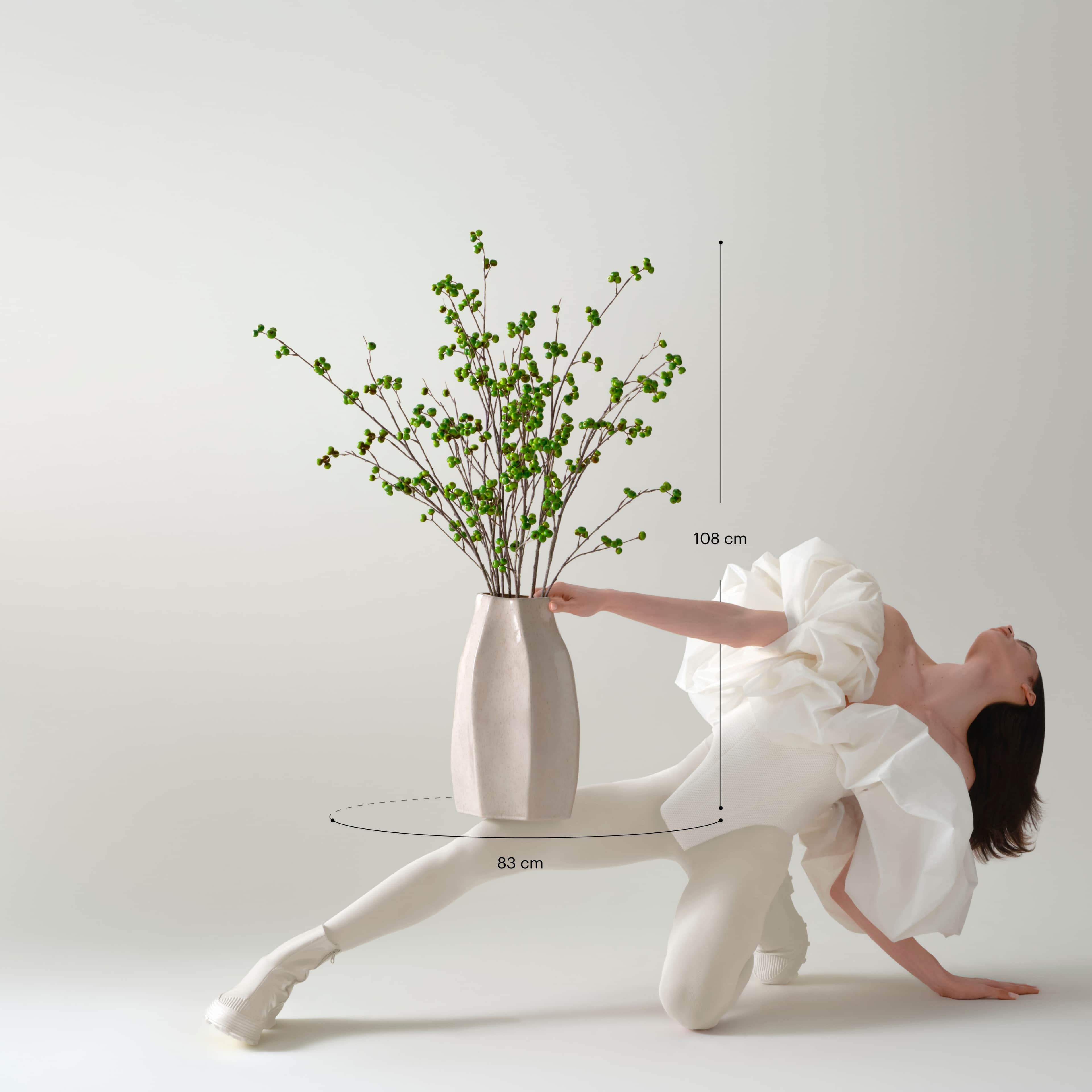 Een stoer en tegelijkertijd rustig zijden boeket met groene bessentakken, geschikt in een robuuste beige keramieken vaas. Het boeket wordt geleverd met ons gratis bloemparfum.