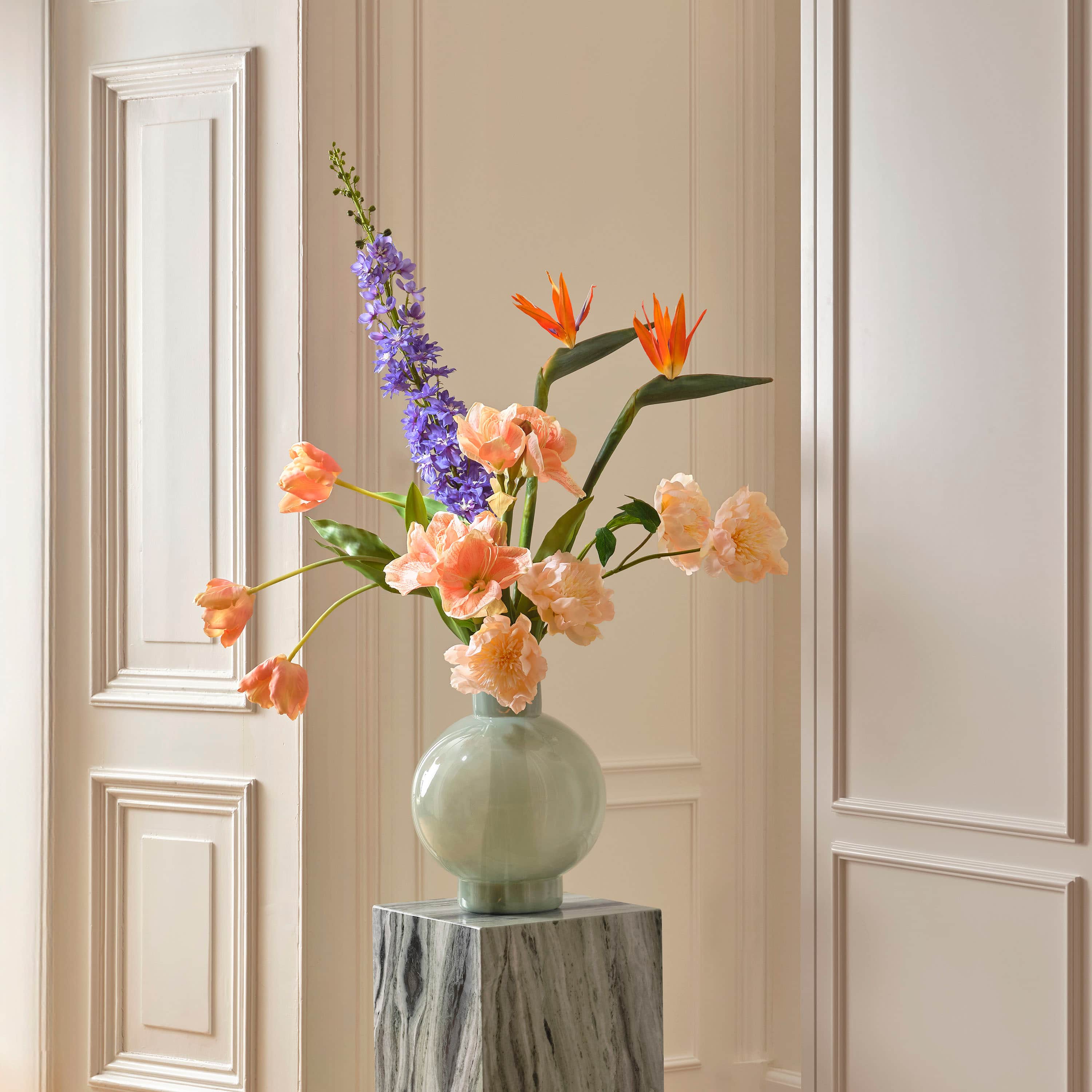 Een weelderig en opvallend boeket van zijden strelitzia, paarse delphinium, nude tulpen & bloeiende pioenen in een zachtgroene bolvormige vaas. Dit boeket wordt geleverd met ons gratis bloemparfum.