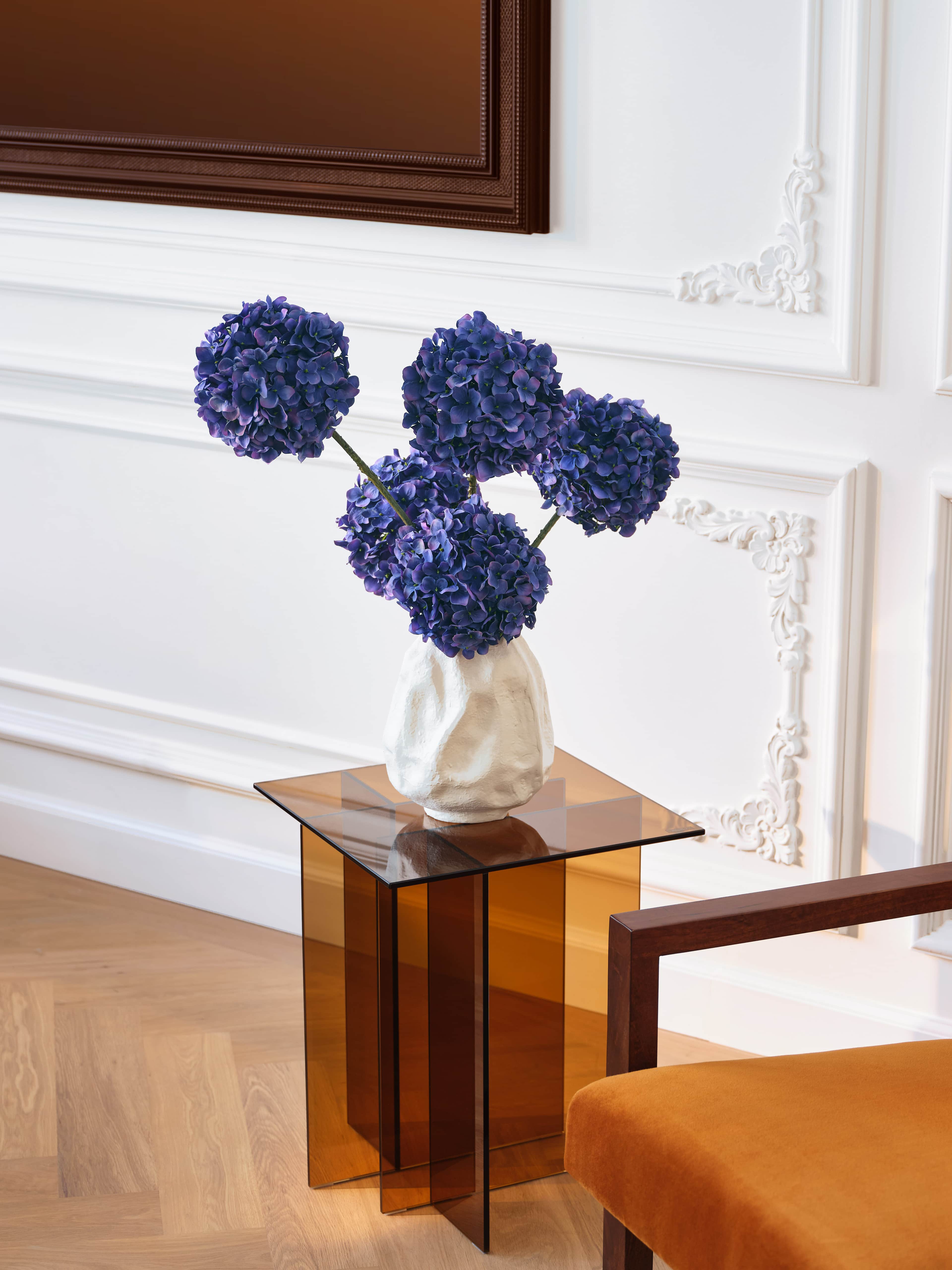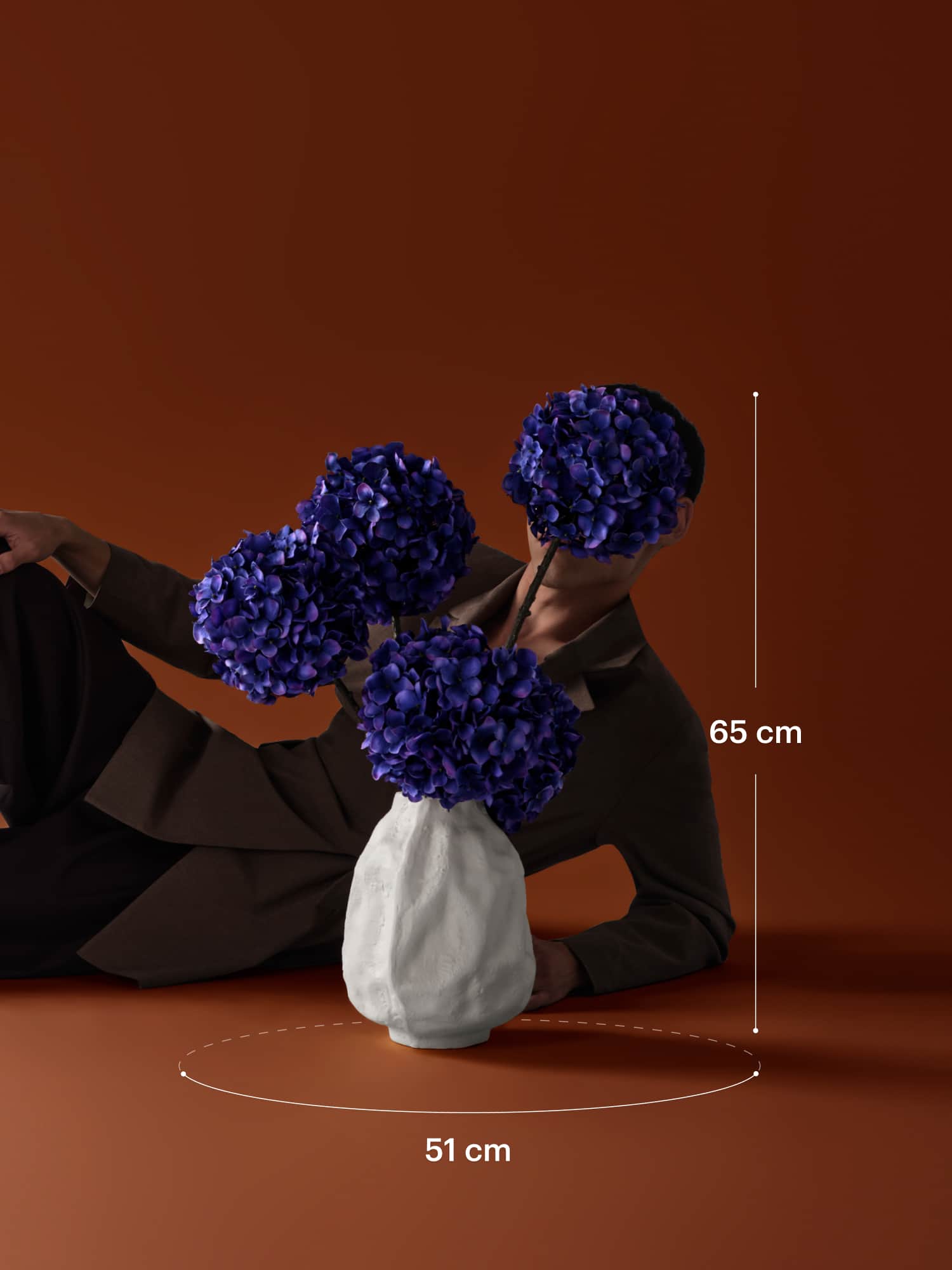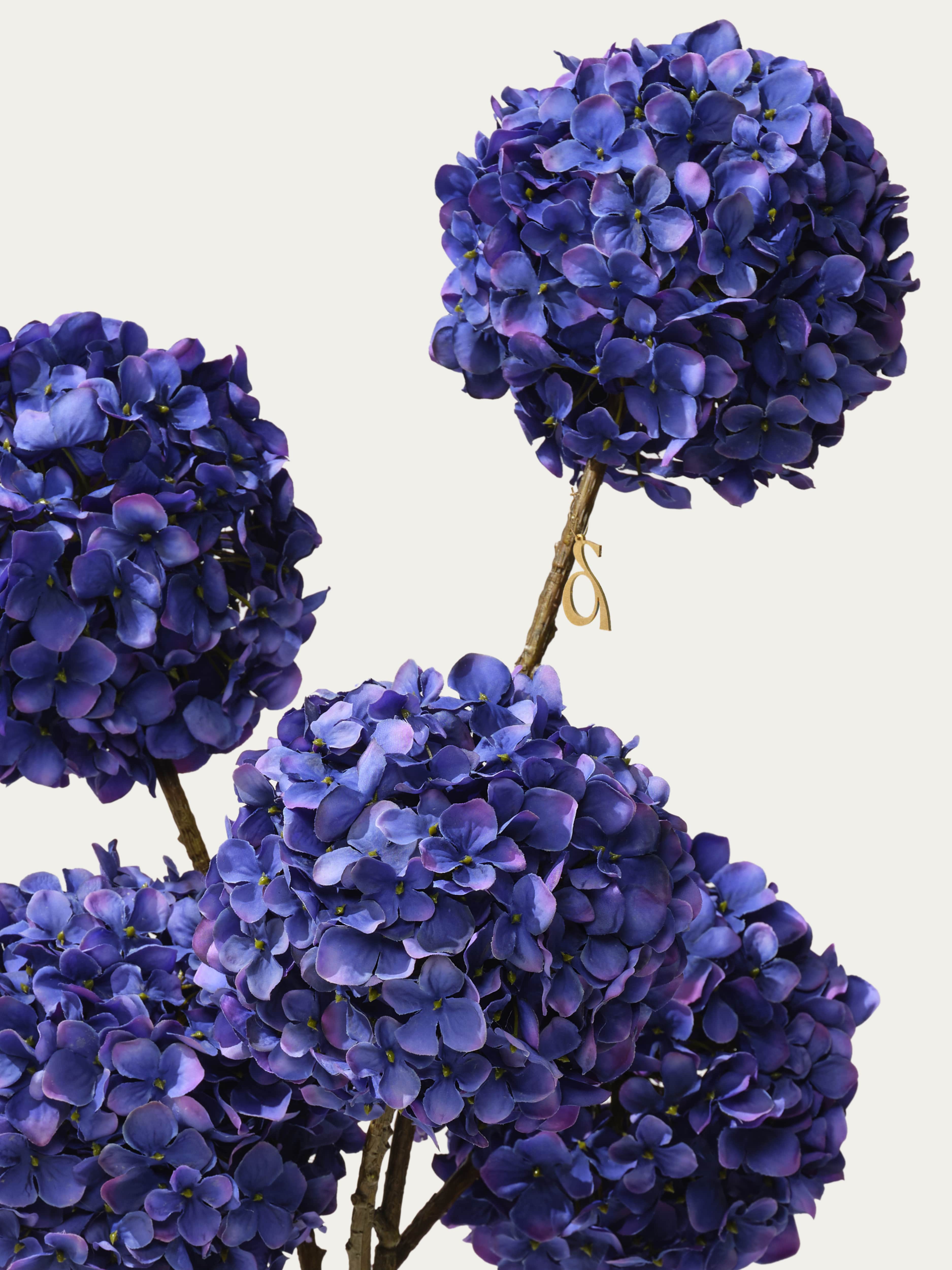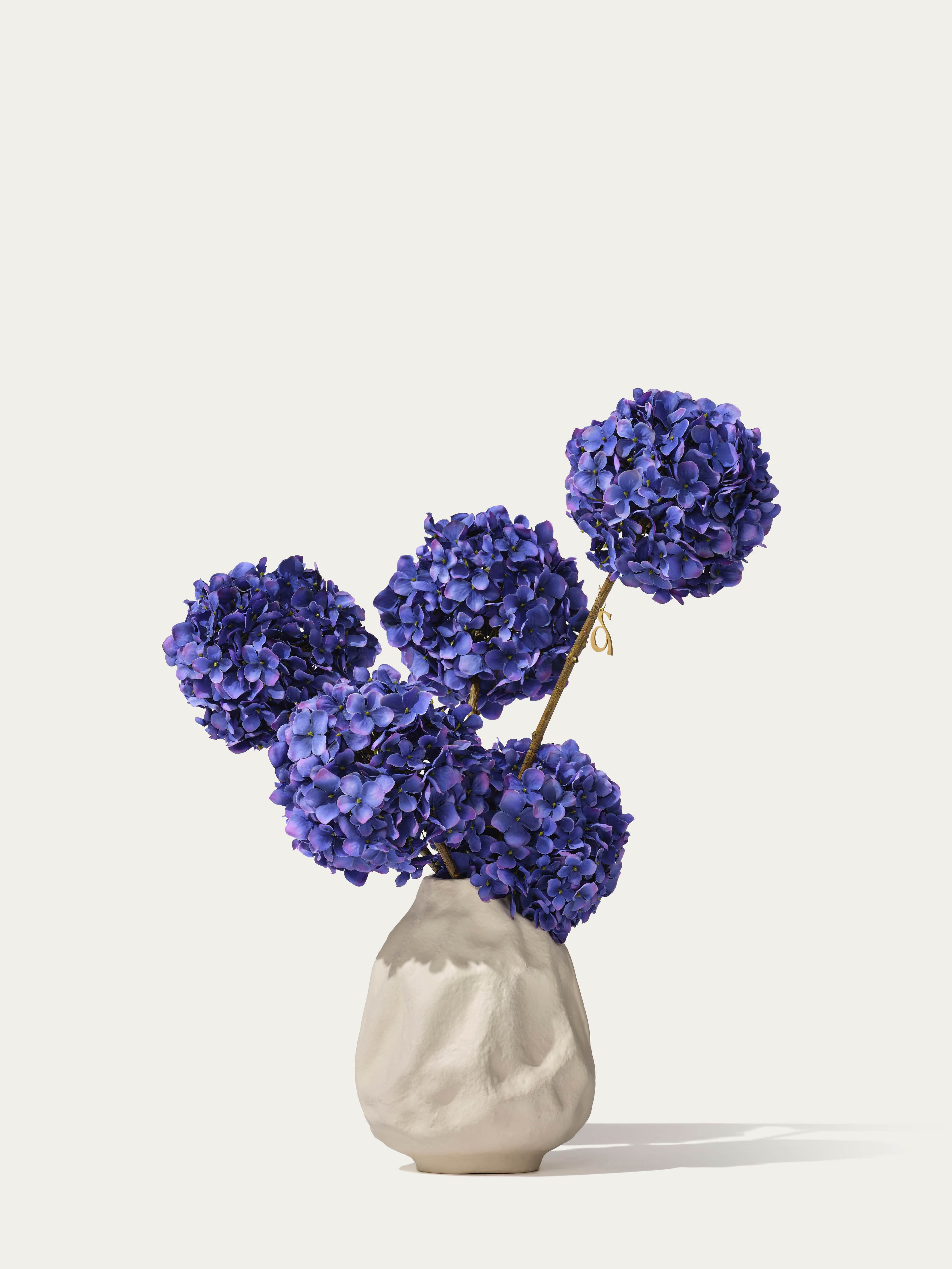 Dit mono boeket van diepblauwe hortensia's wordt prachtig gepresenteerd in een crèmekleurige organische vaas. Arriveert met ons gratis bloemparfum.