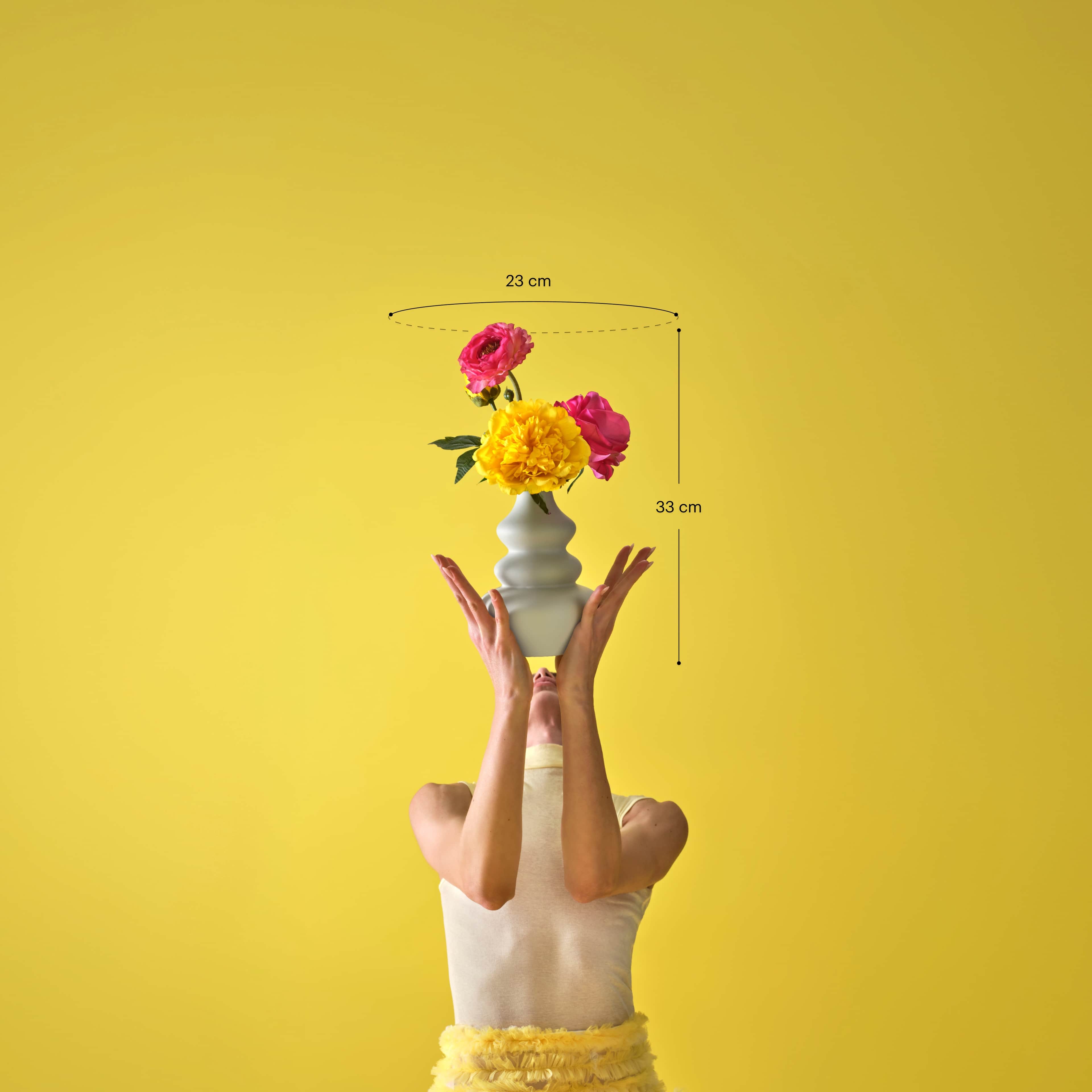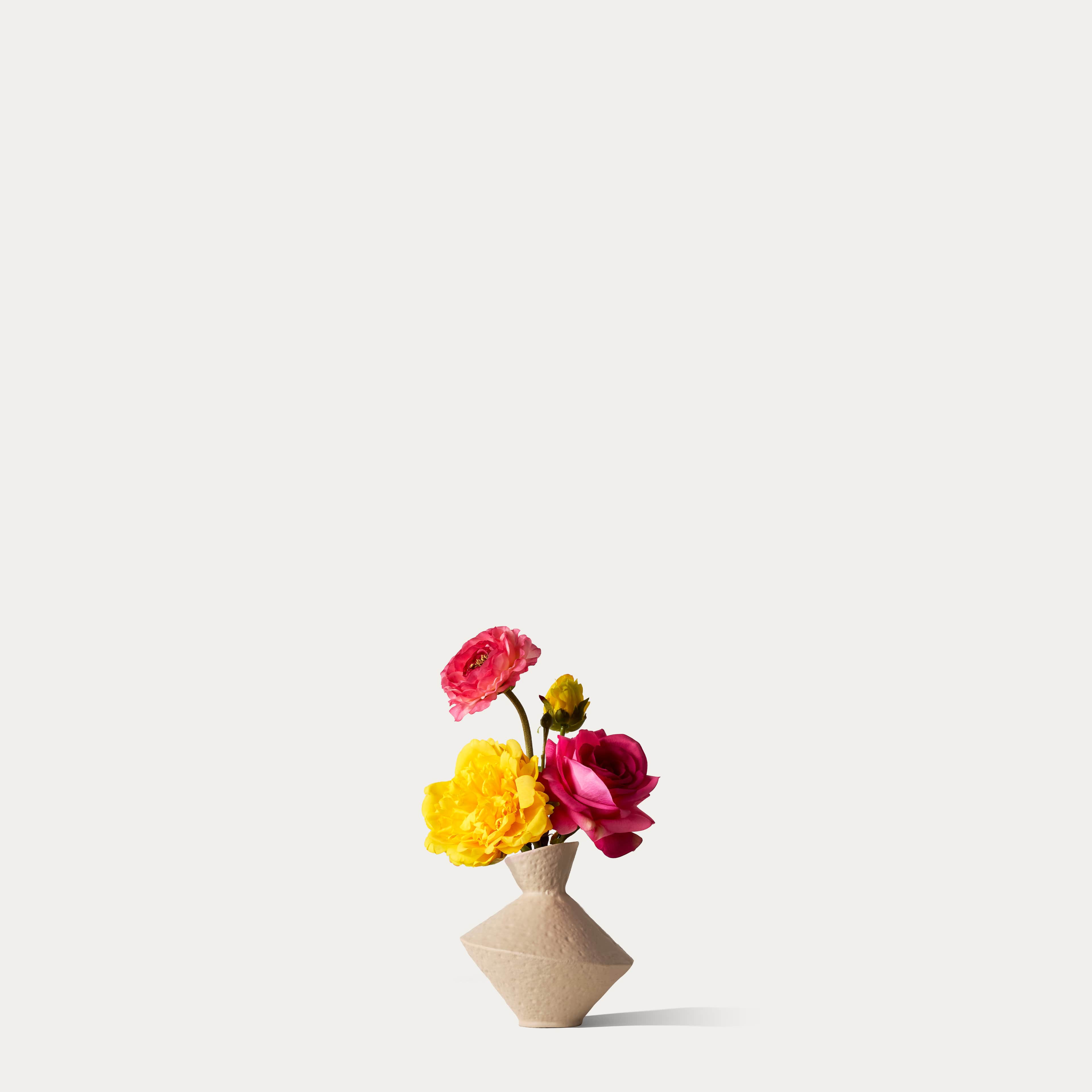 Een romantisch zijden boeket met real-touch gele pioen, roze ranonkel en fuchsia roos, geschikt in een organisch vaasje. Het boeket wordt geleverd met ons gratis bloemparfum.