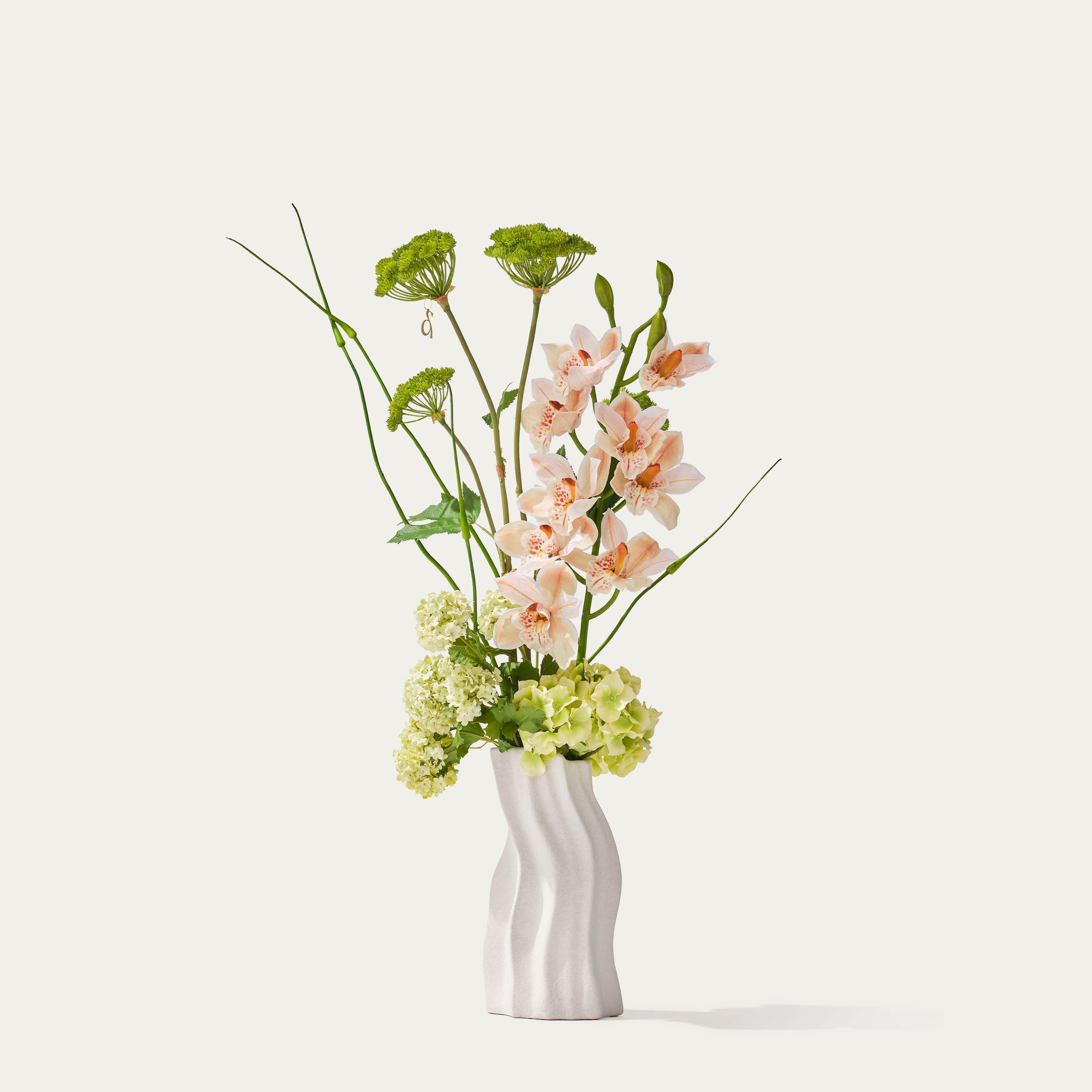 Een boeket van zijden cymbidium orchideeën, Japanse knoflook en wilde engelwortel in een sierlijke stenen vaas. Arriveert met ons gratis bloemparfum.
