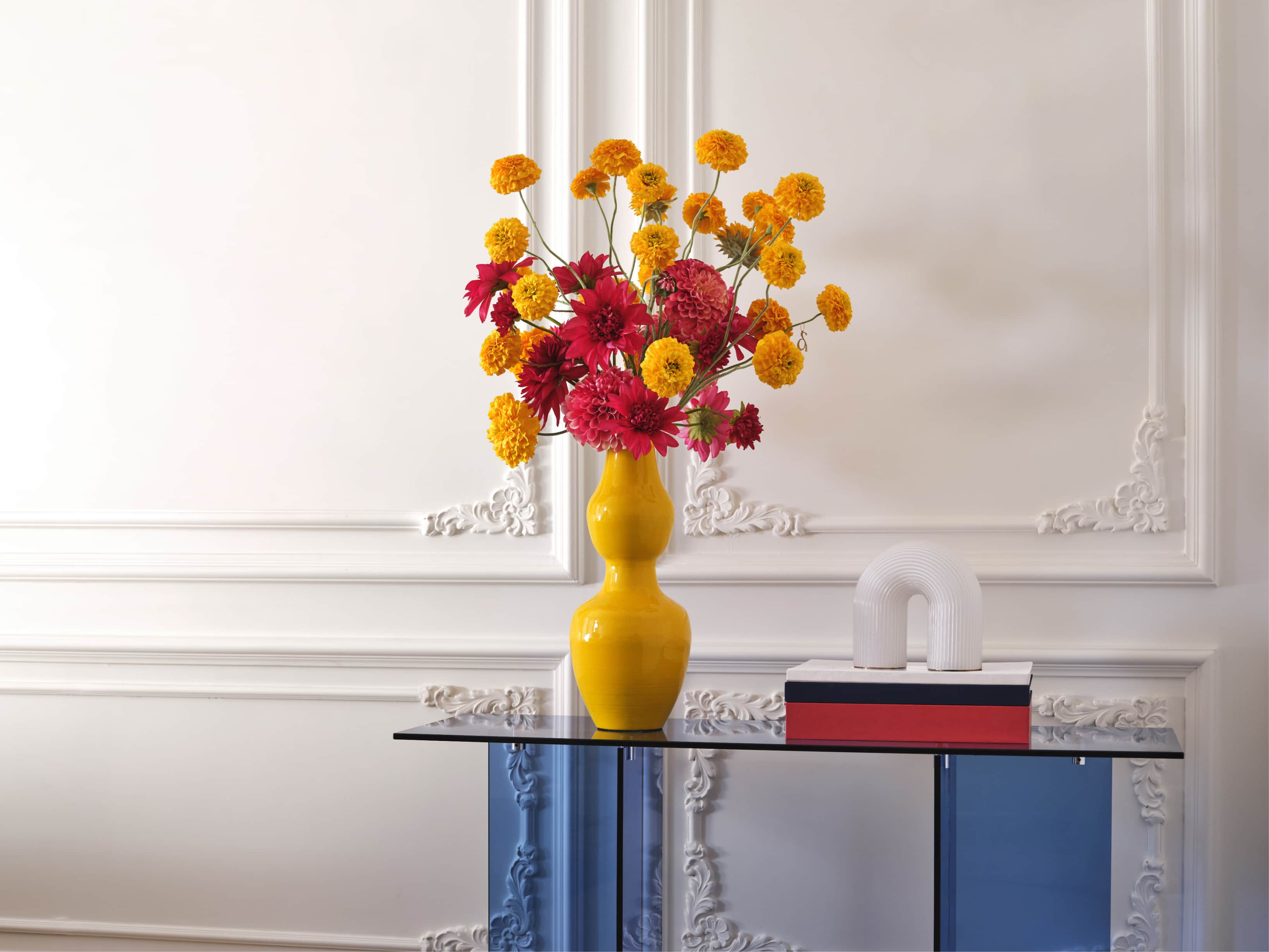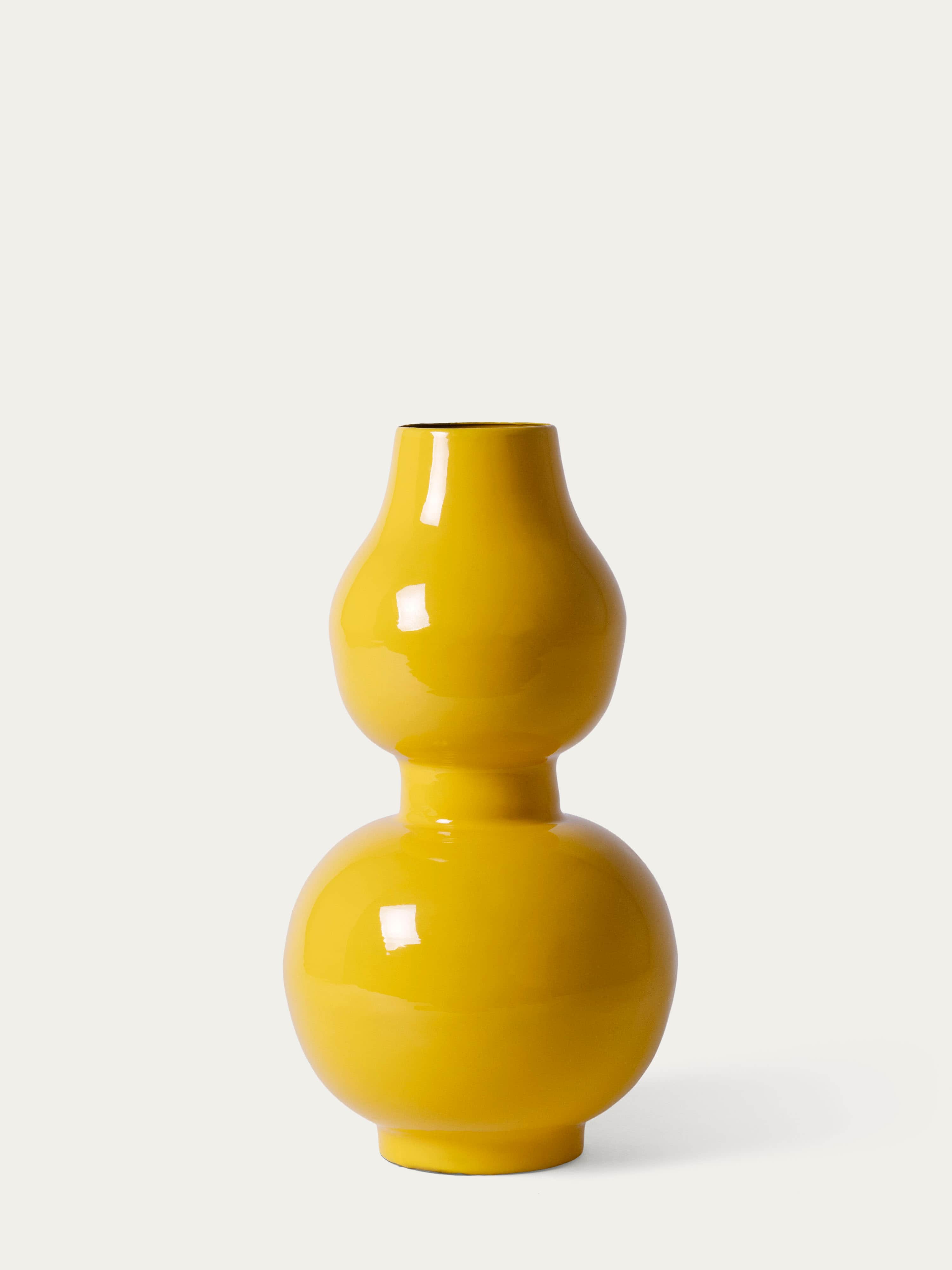 Een heldergele vaas met een ronde uitstulping in het midden. Speels en opvallend, maar elegant in balans.